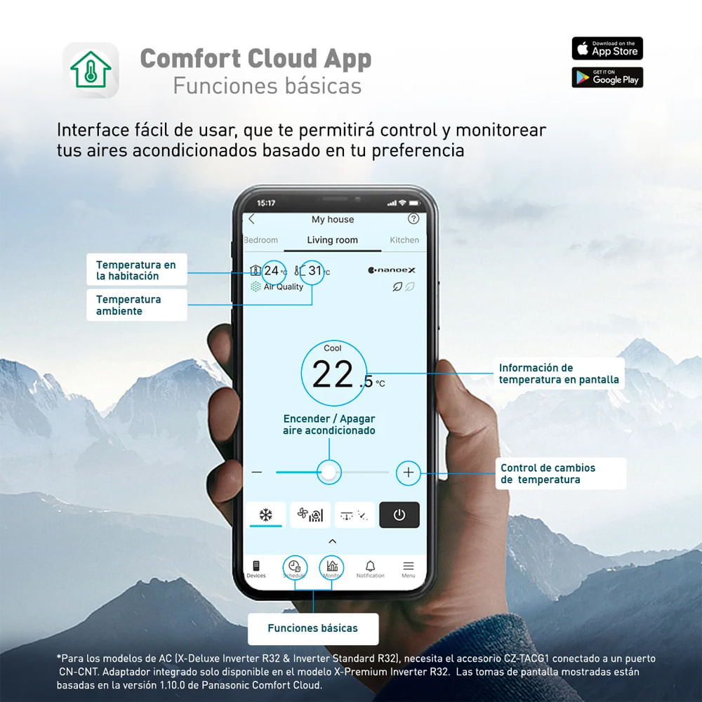 - Conectividad Wi-Fi y aplicación Panasonic Comfort Cloud: controla y monitorea el equipo desde cualquier lugar, con diagnóstico y ajustes remotos.