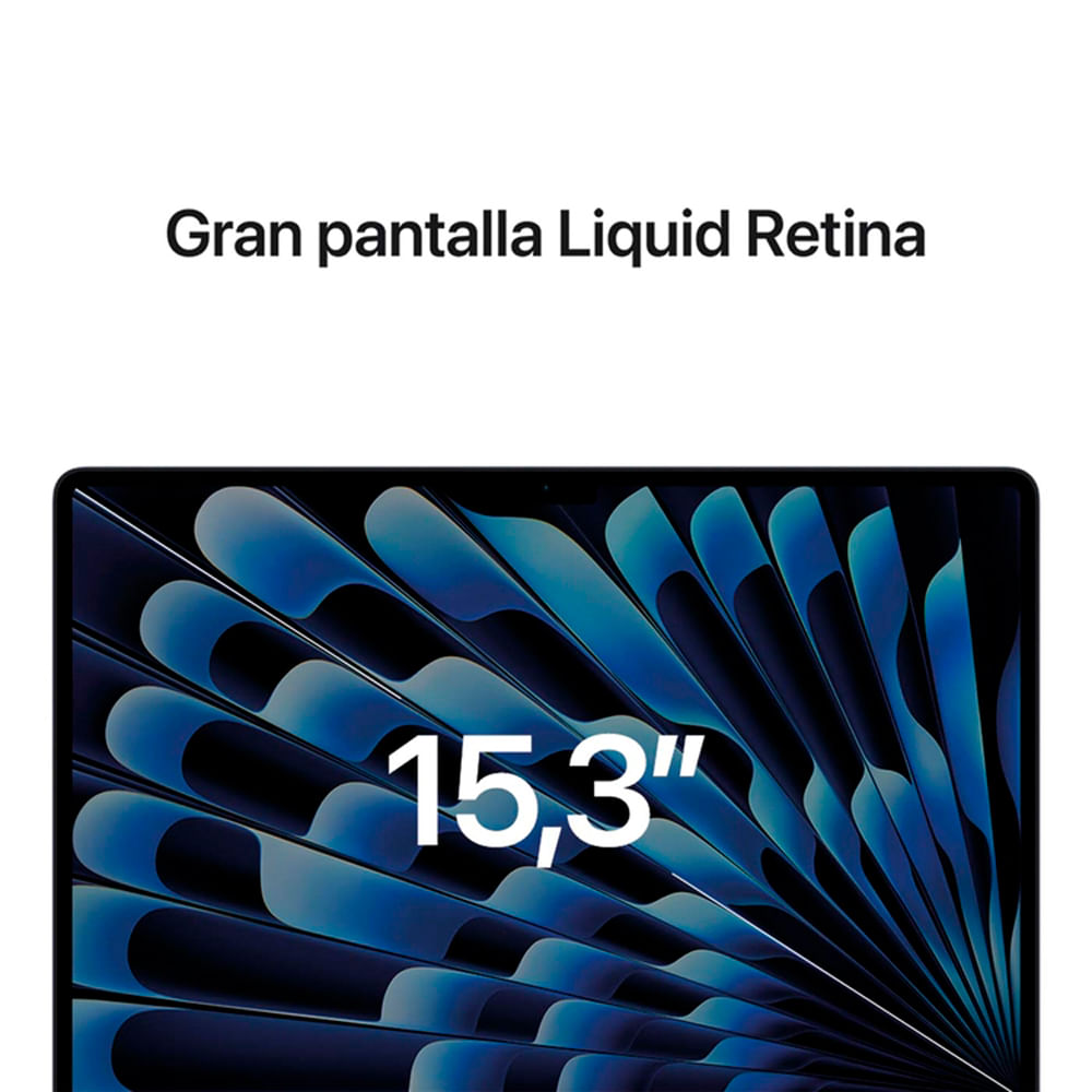 La MacBook Air Retina de Apple tiene una pantalla de 15.3 pulgadas y un color gris espacial. Cuenta con retroiluminación en el teclado y pertenece a la familia de procesadores Apple M, específicamente a la segunda generación del mismo.