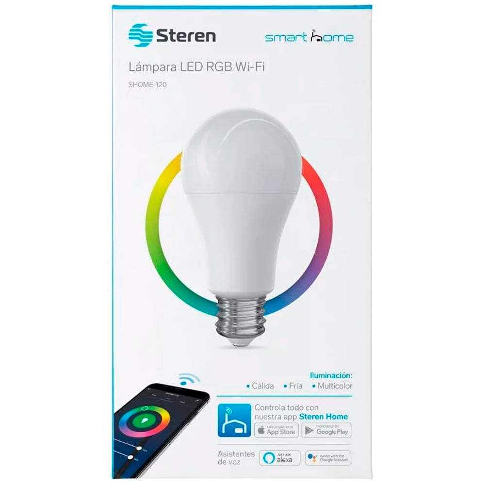 App Steren Home: Su uso se administra por medio de nuestra app Steren Home, desde donde puedes cambiar el color o intensidad de la iluminación, controlar el encendido y apagado instantáneo o por programación de horarios y rutinas, compartir el control con otros usuarios y mucho más.
