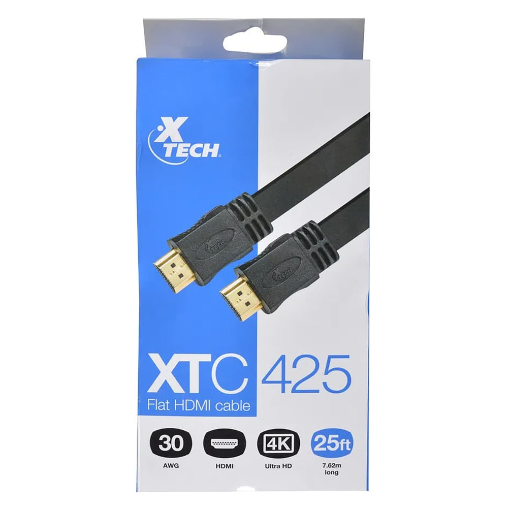 Cable HDMI de alta calidad de la marca Xtech, modelo XTC425. Ideal para conectar dispositivos electrónicos y transmitir video y audio con claridad. La longitud de 25 pies proporciona suficiente alcance para instalaciones en habitaciones grandes y configuraciones de entretenimiento.