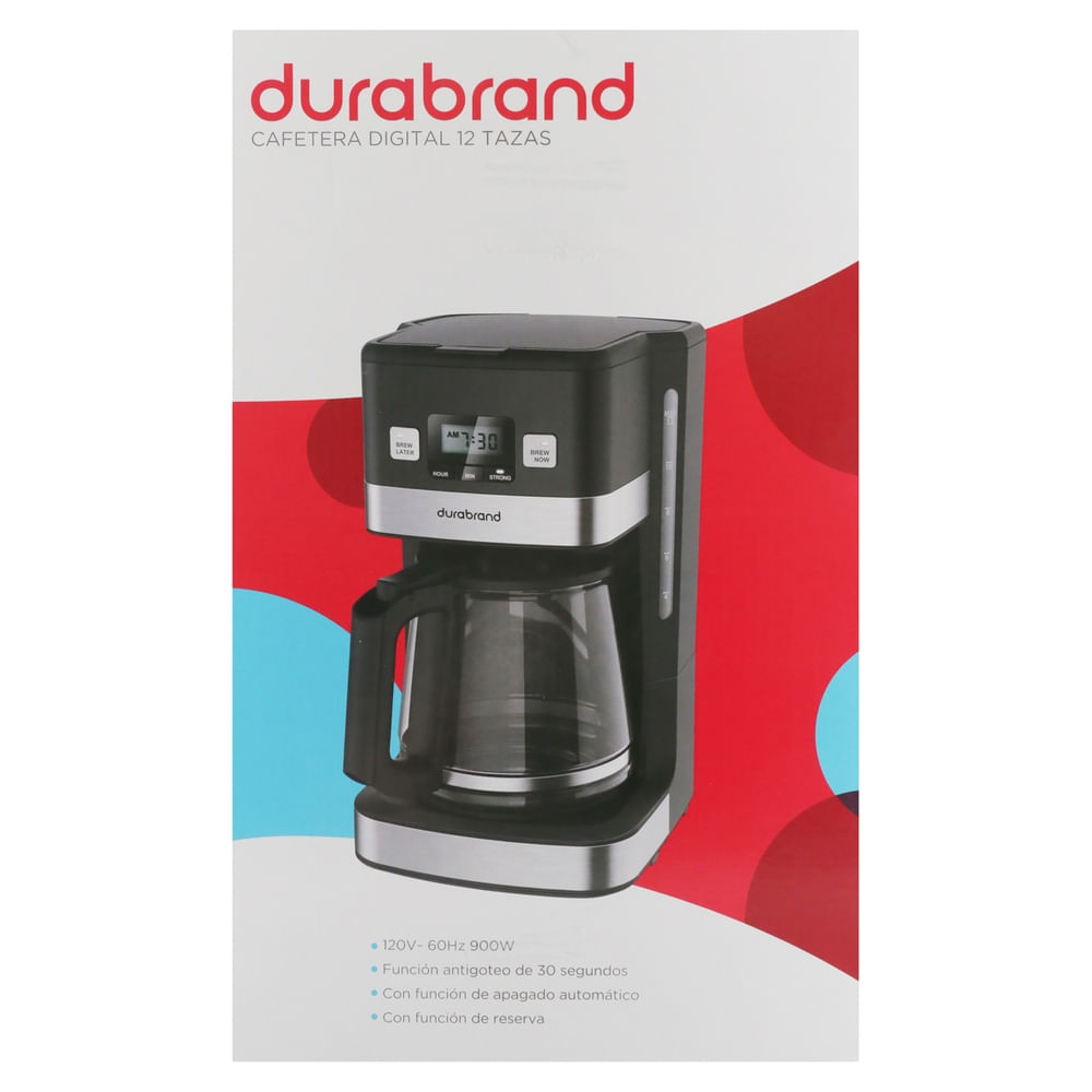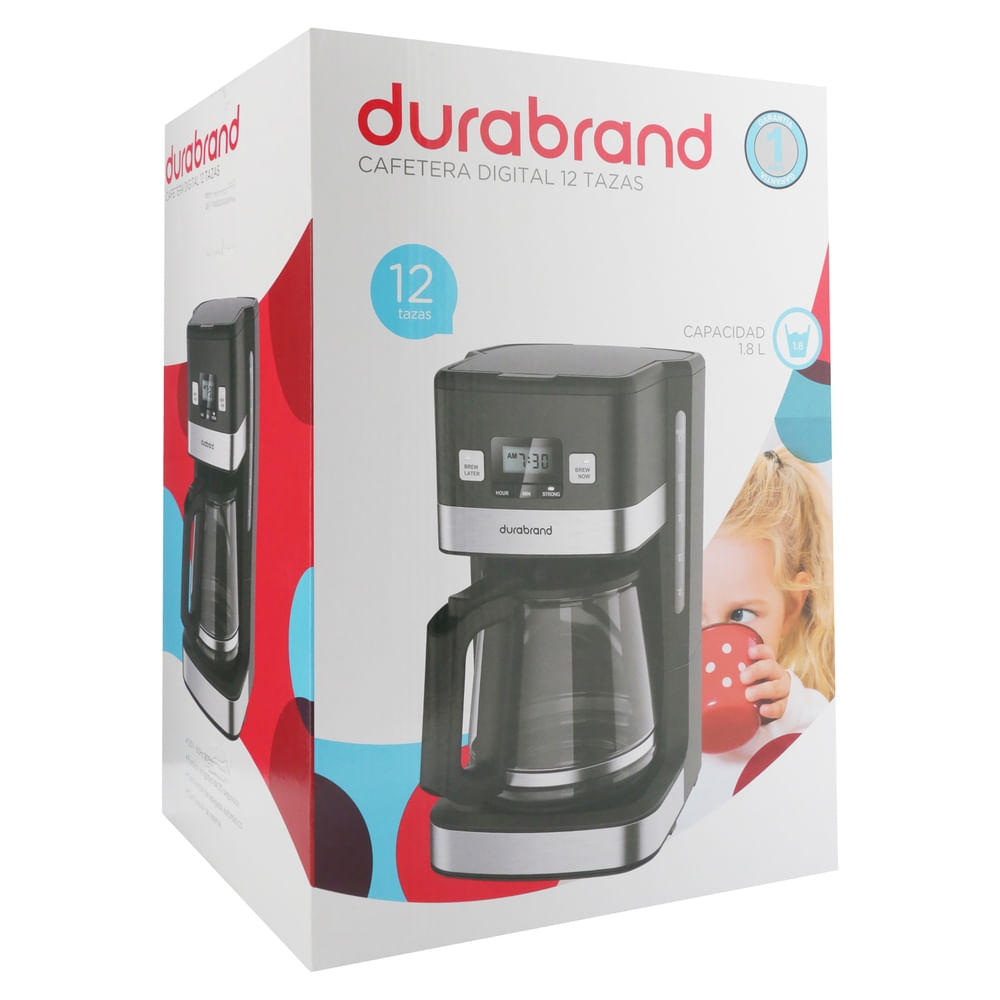 La cafetera Durabrand digital con capacidad para 12 tazas combina tecnología y funcionalidad para el uso cotidiano. Su panel digital facilita programar la preparación del café según la rutina diaria, asegurando bebidas listas a tiempo. Cuenta con jarra resistente y sistema de goteo uniforme. Es ideal para hogares que buscan control y comodidad en cada preparación. Compra en línea y disfruta café preparado a tu ritmo.