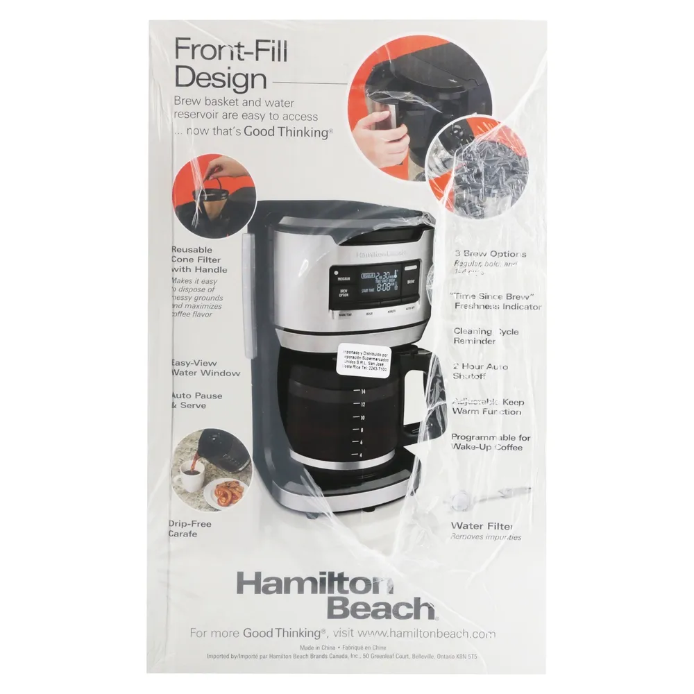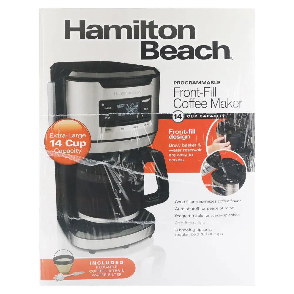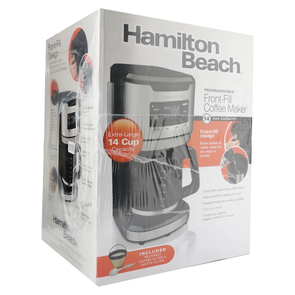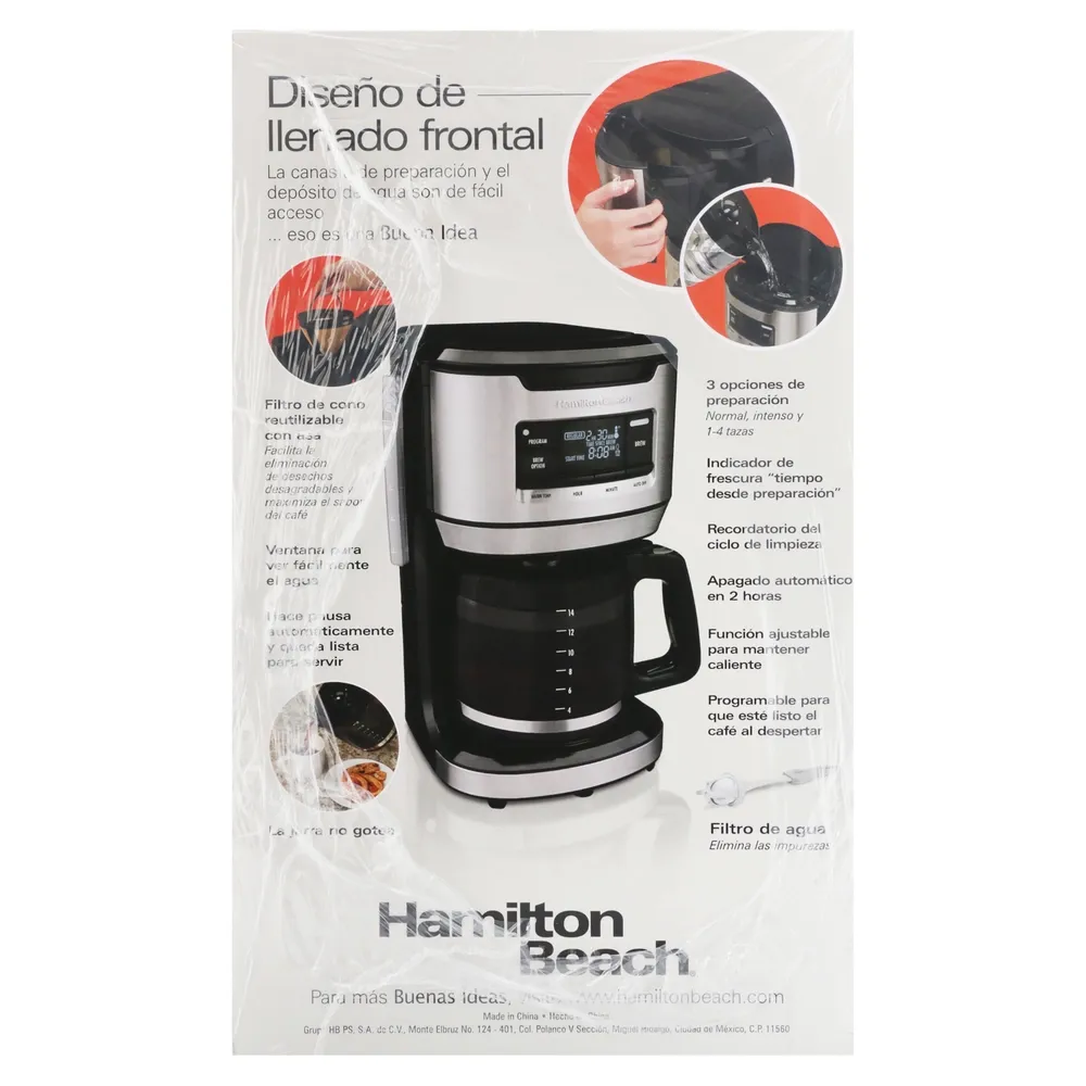 La cafetera programable Hamilton Beach con capacidad para 14 tazas está pensada para hogares grandes u oficinas donde se consume café con frecuencia. Su función programable permite dejar lista la preparación con anticipación, asegurando café caliente a la hora deseada. La amplia capacidad facilita servir a varias personas en un solo ciclo, optimizando el tiempo durante reuniones. Cuenta con jarra resistente, controles intuitivos y sistema de goteo uniforme. Es ideal para quienes buscan comodidad y eficiencia en la rutina cafetera. Compra en línea y asegura café suficiente para todos.