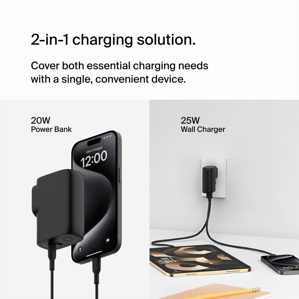 - Carga dual potente y eficiente: En modo batería, proporciona una salida combinada de 20W a través de sus puertos USB-A y USB-C para cargar dos dispositivos simultáneamente. Cuando está conectado a una toma de corriente, puede entregar hasta 25W para una carga rápida y continua.