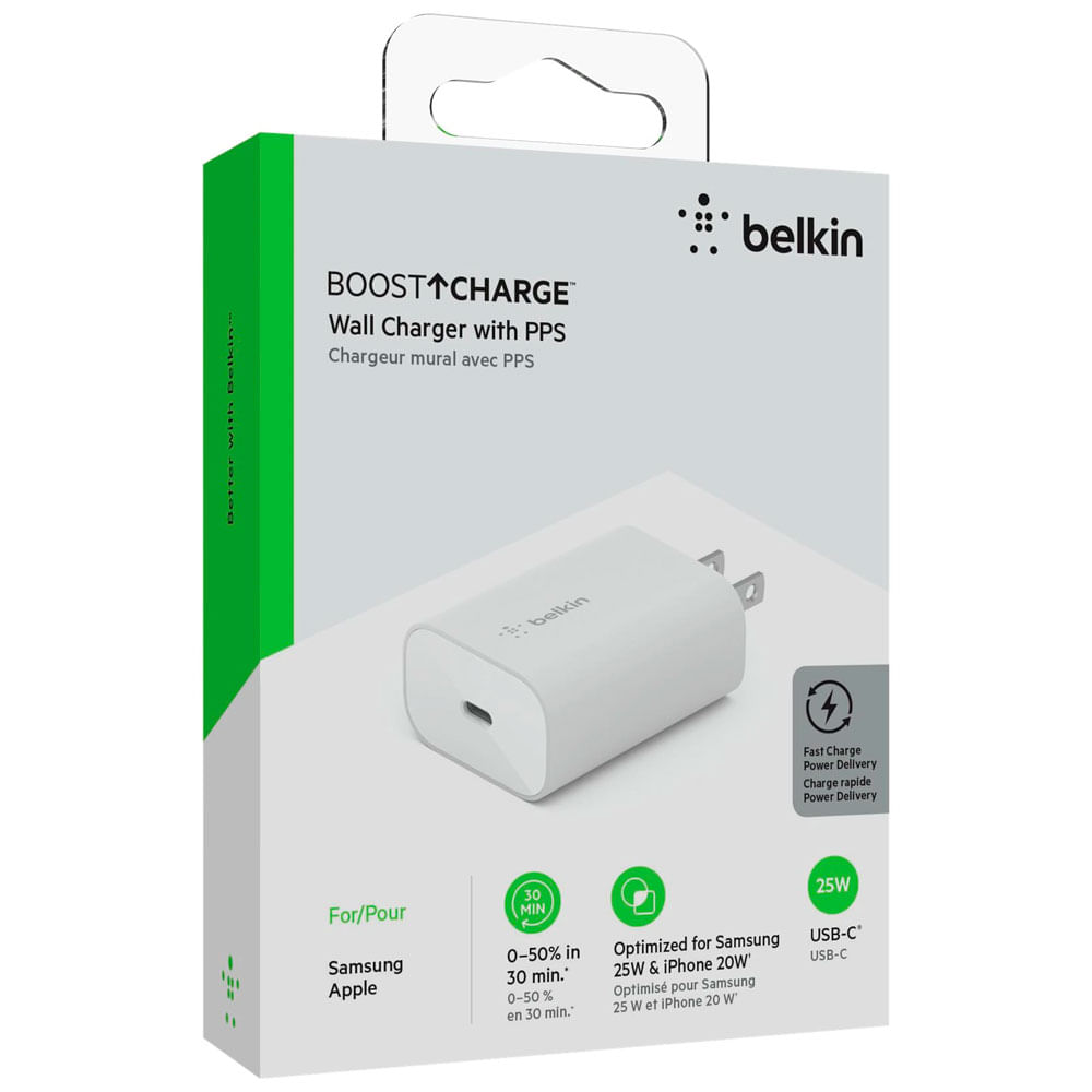 Incluye un cargador de pared USB-C BOOSTCHARGE de 25 W de Belkin. (Cable no incluido).