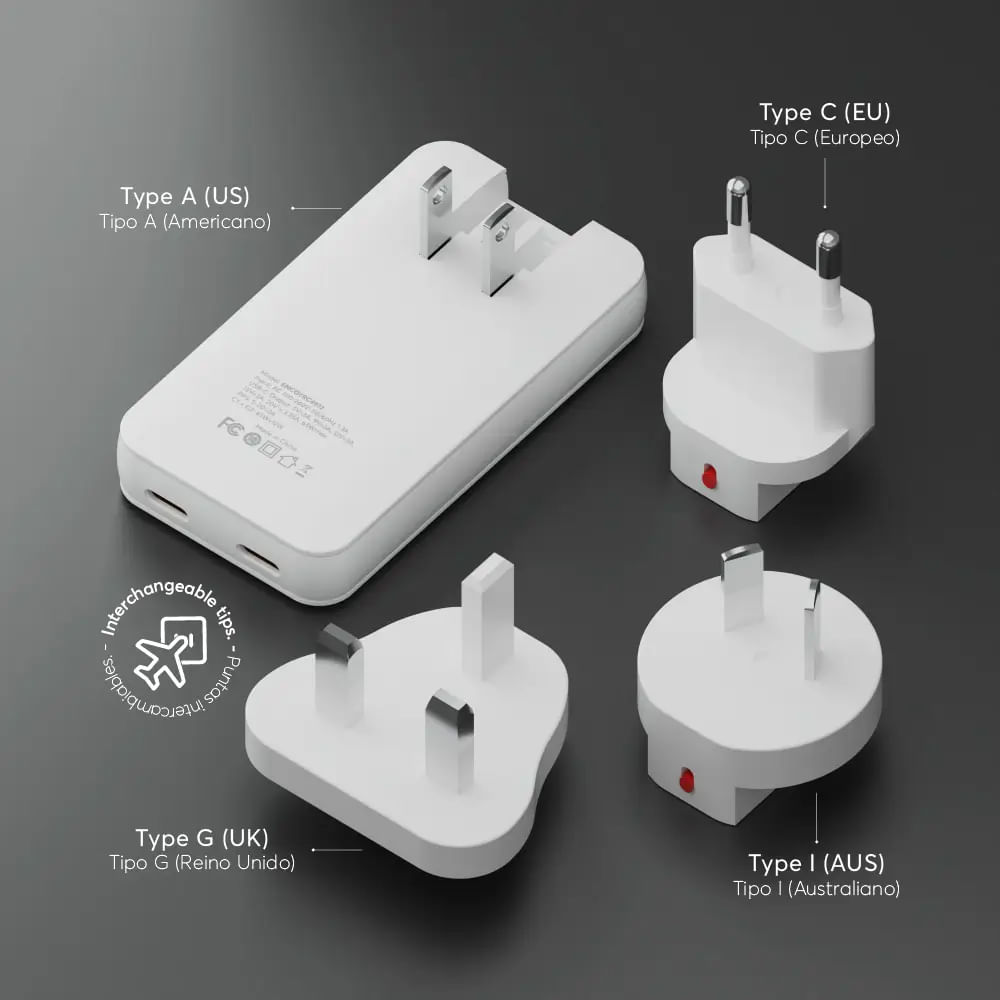 - Versión Travel con adaptadores para EE. UU., Europa y Australia.