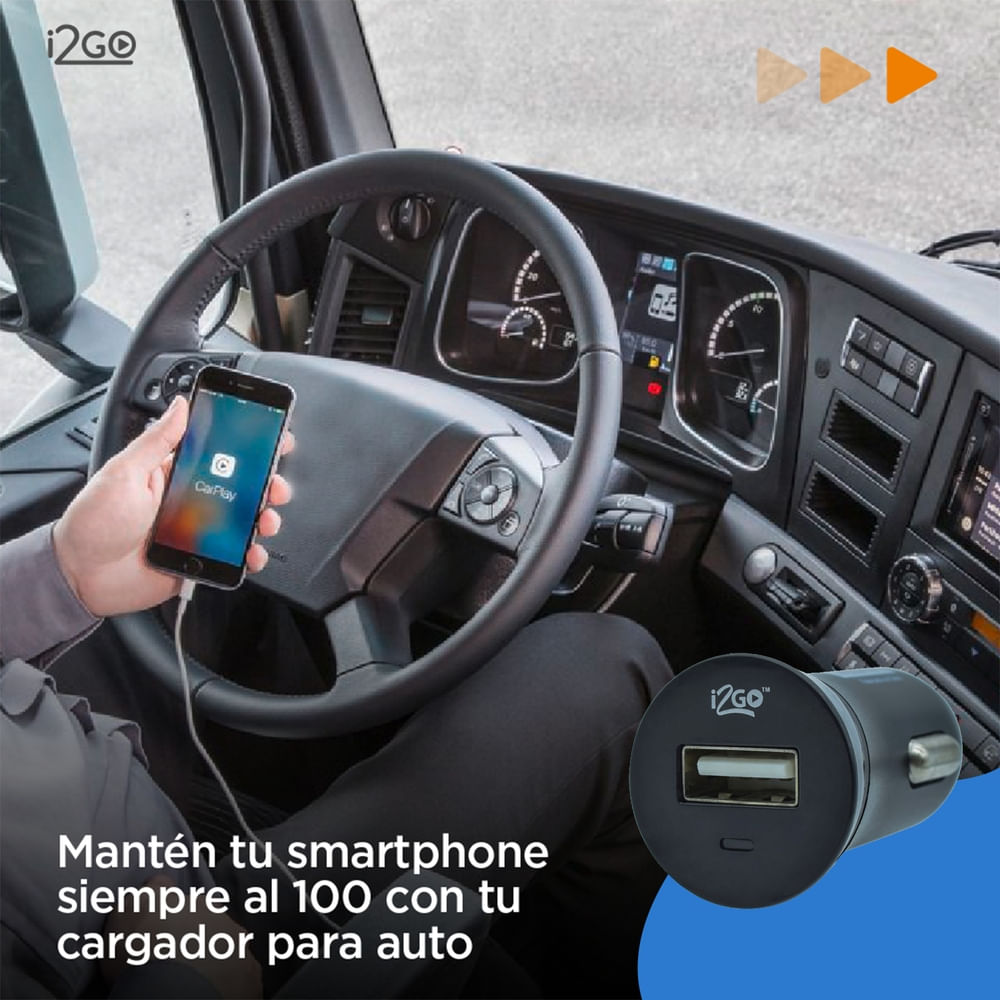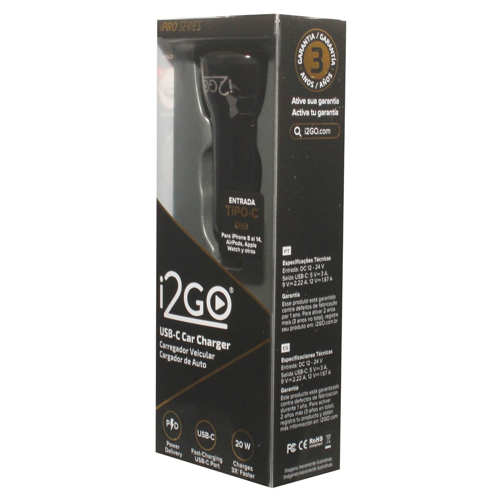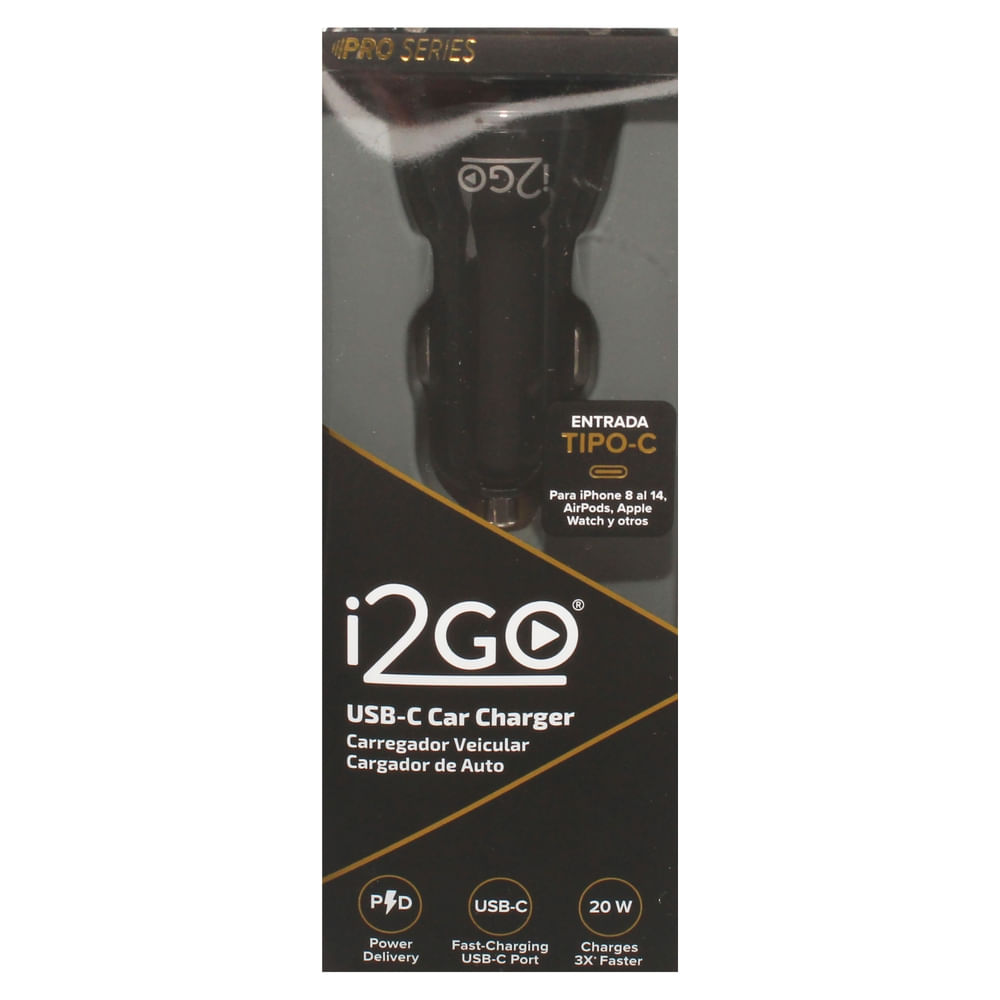 El cargador de auto Tipo C de I2GO ofrece 20W de potencia para carga rápida de dispositivos móviles. Ideal para mantener tus gadgets con energía durante tus viajes.