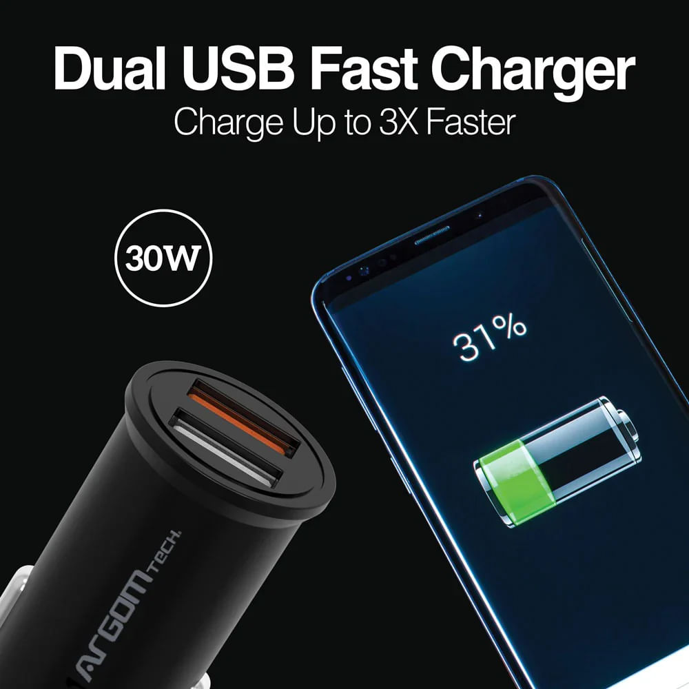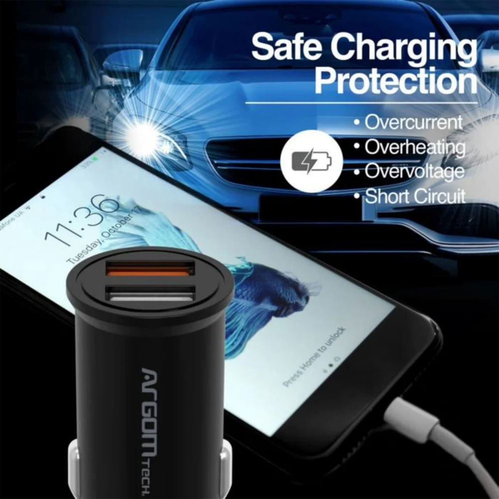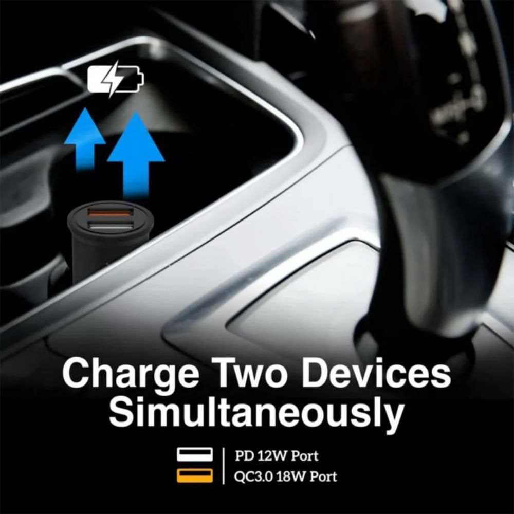 Lleva la potencia contigo y mantén tus dispositivos siempre listos, incluso en carretera. Este cargador de auto cuenta con dos puertos USB —uno QC3.0 de 18 W y otro de 12 W— que permiten cargar dos dispositivos simultáneamente hasta tres veces más rápido que un cargador convencional. Su tecnología de carga segura protege tu celular y tablet contra sobrecorrientes, sobretensiones y cortocircuitos, garantizando una recarga eficiente y confiable durante cada trayecto.