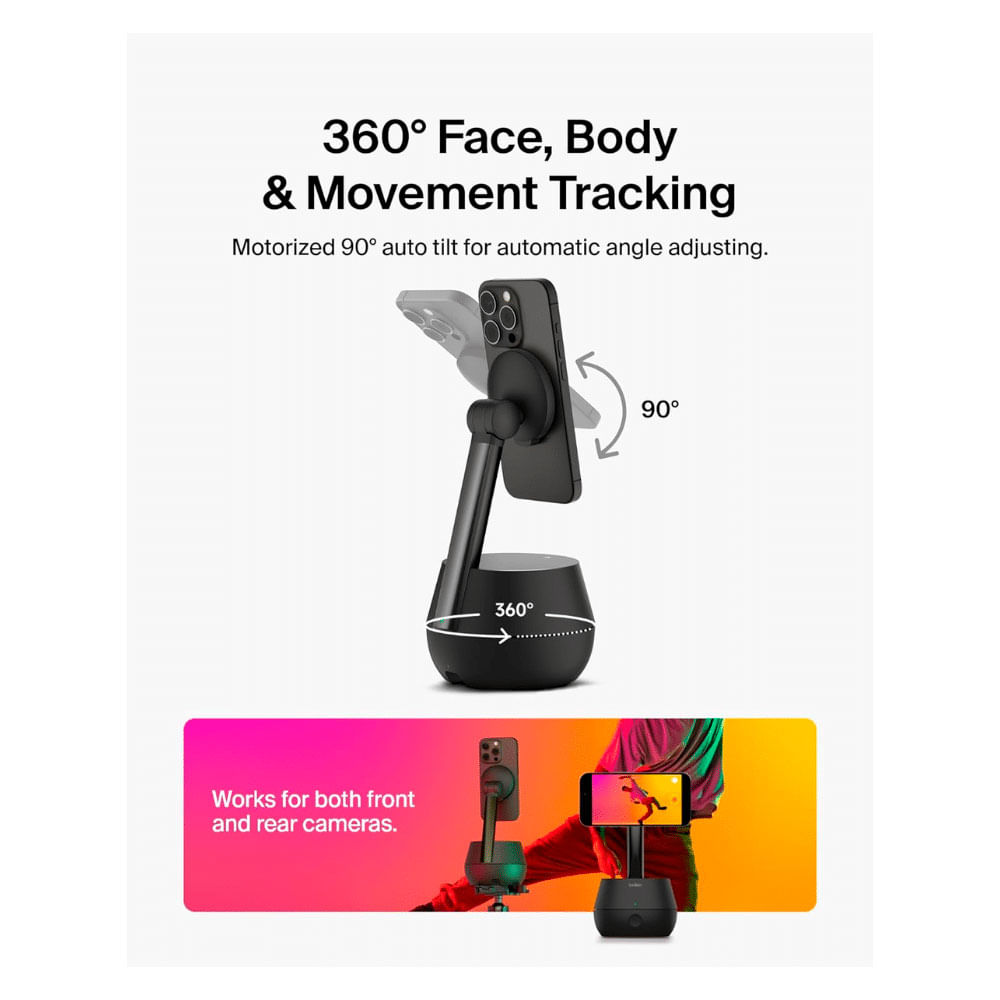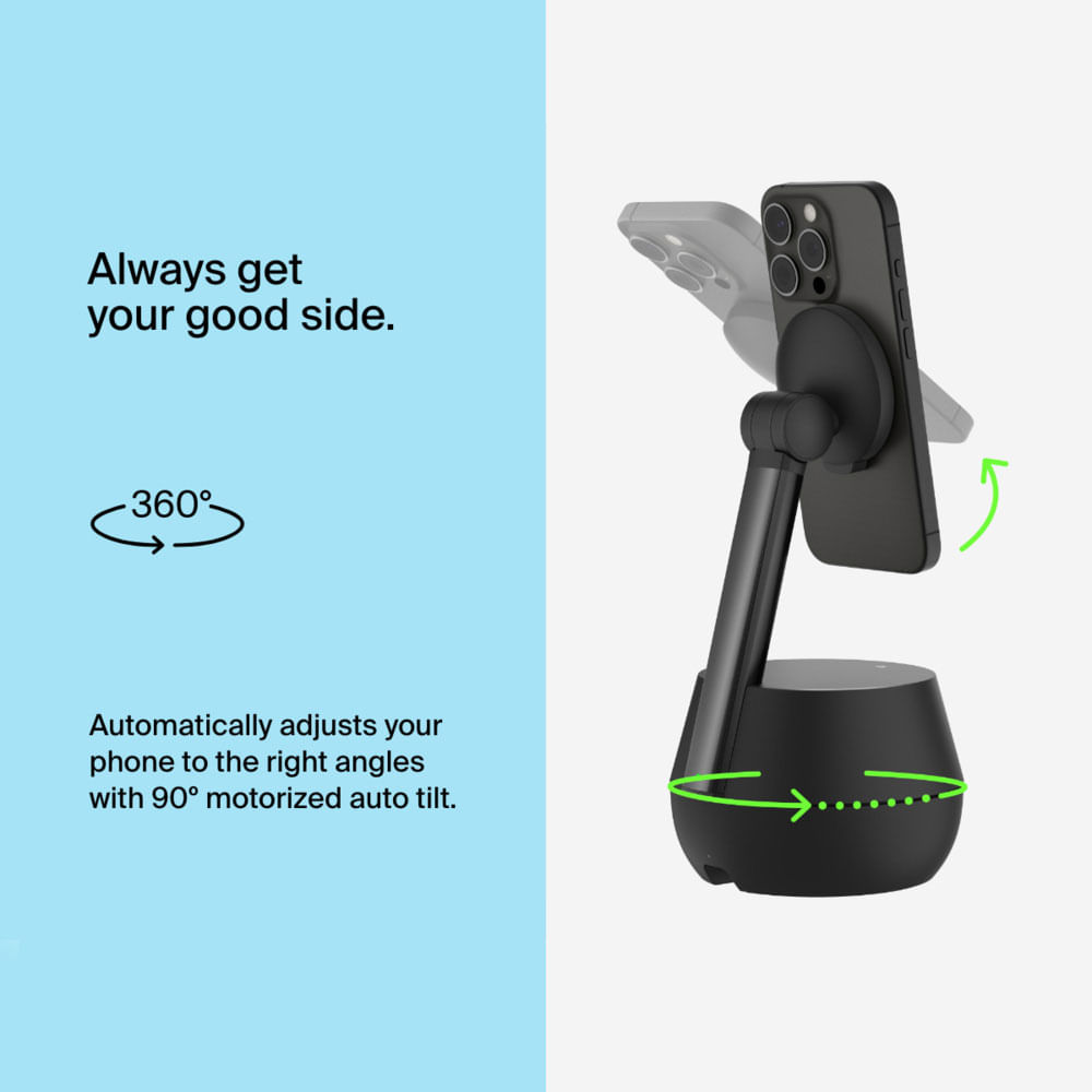 Convierte tus videollamadas y transmisiones en experiencias profesionales y dinámicas con el Soporte de Seguimiento Automático Belkin Stand Pro con DockKit para iPhone. Equipado con tecnología de seguimiento facial y corporal, este soporte gira 360° e inclina hasta 90°, asegurando que siempre permanezcas centrado en la imagen mientras te mueves con naturalidad.