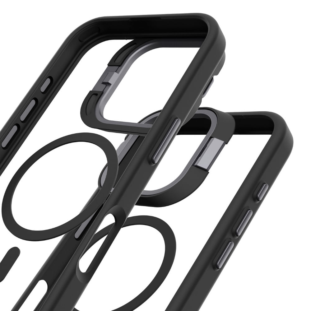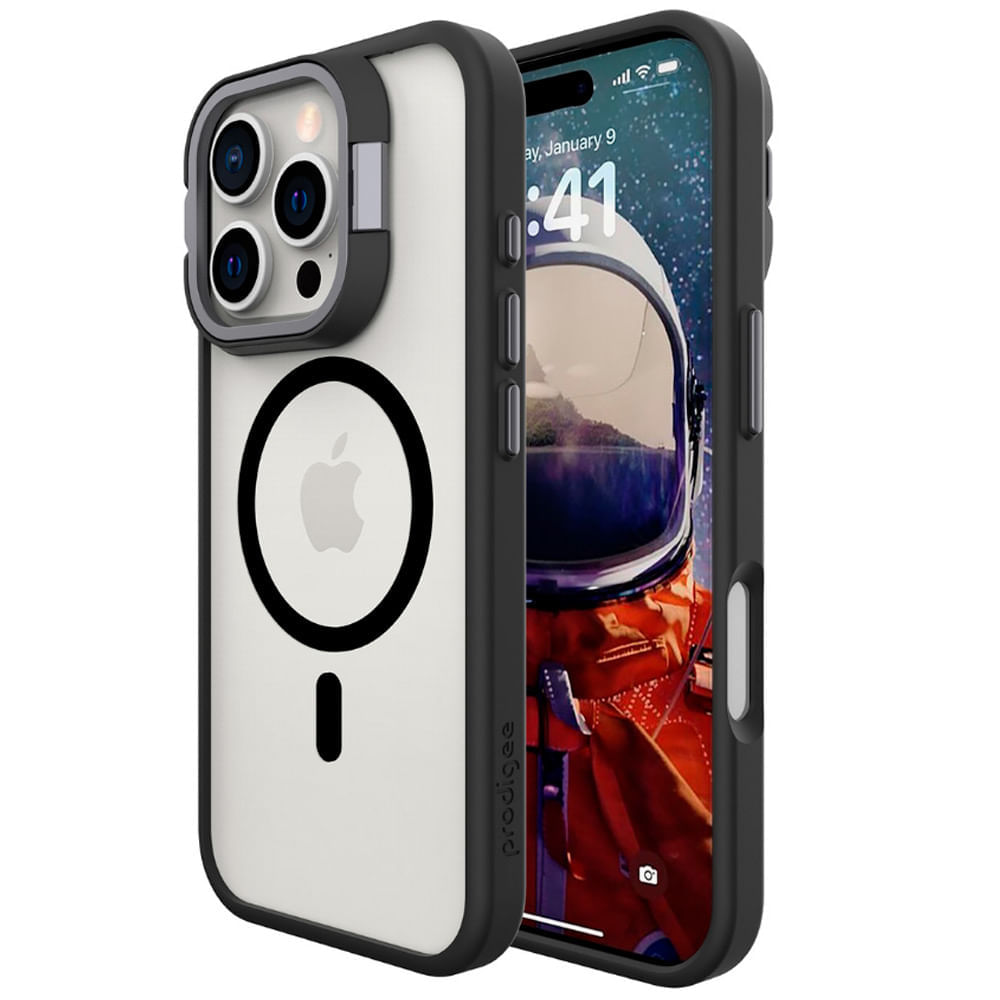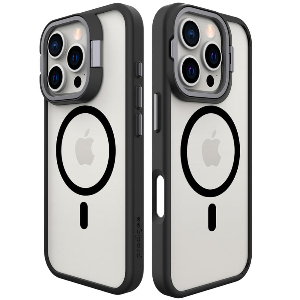 Prodigee con soporte integrado y tecnología Mag. Su diseño elegante combina materiales de alta resistencia que absorben impactos y mantienen la estética original del dispositivo gracias a su panel trasparente. Con imanes perfectamente alineados, se acopla con firmeza para una carga inalámbrica segura y es compatible con todos los accesorios Mag de Prodigee. Además, incorpora un soporte funcional que brinda el ángulo de visión ideal para trabajar, ver videos o videollamadas.