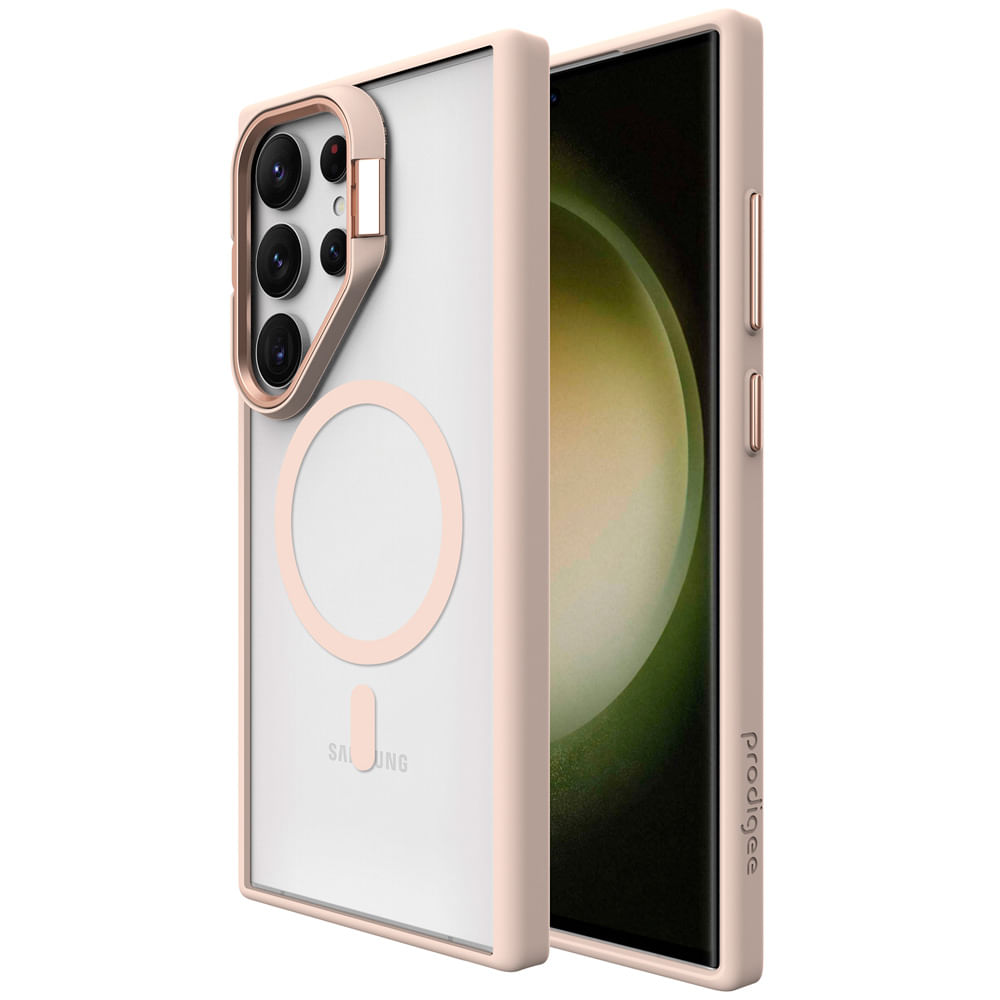 Prodigee con soporte integrado y tecnología Mag. Su diseño innovador combina elegancia, resistencia y practicidad, ofreciendo un ajuste perfecto con materiales premium de tres capas que absorben impactos. El soporte incorporado brinda un ángulo de visión cómodo, ideal para ver videos o realizar videollamadas. Además, gracias a sus imanes integrados, se alinea con precisión para una carga inalámbrica estable y es compatible con los accesorios Prodigee con función "Mag".