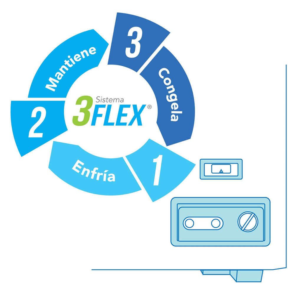 Control total de temperatura- Tecnología 3Flex: permite operar en tres modalidades – Enfriador (10 °C a 0 °C), Mantenedor (–5 °C a –14 °C) o Congelador (–18 °C) – adaptables según tipo de producto.