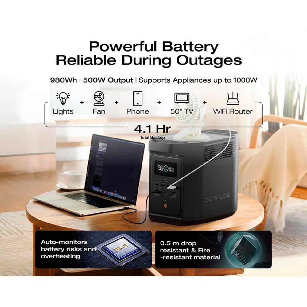 - Alta capacidad y rendimiento estable: Con 980 Wh de capacidad y salida de 500 W (hasta 650 W en modo extra boost), el E980 mantiene tus dispositivos esenciales funcionando durante emergencias o en zonas sin acceso a energía.
