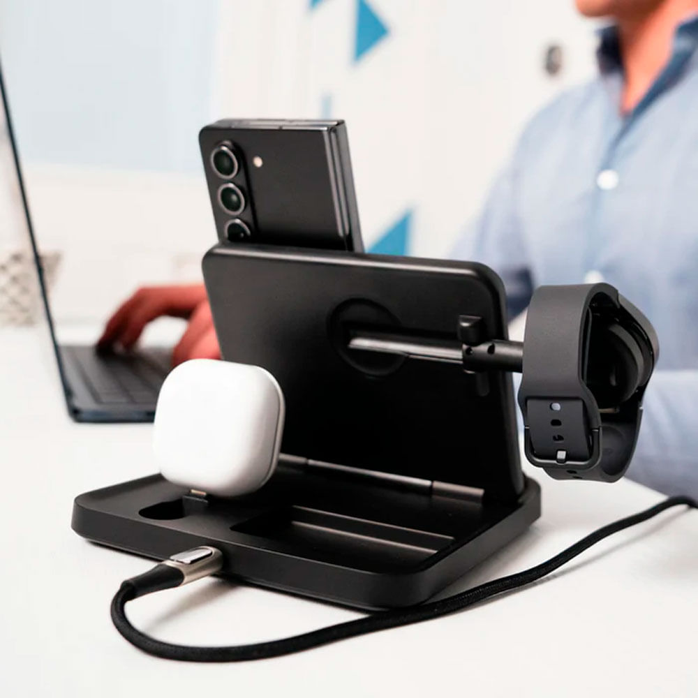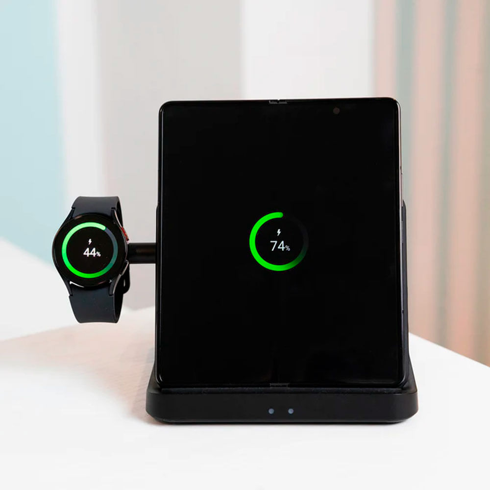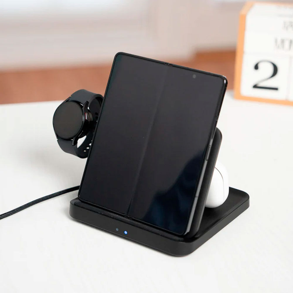 Lleva la experiencia de carga a un nuevo nivel con la Trio Fold Station, la estación de carga inalámbrica diseñada específicamente para dispositivos Samsung. Carga simultáneamente tu smartphone, Galaxy Watch y audífonos Galaxy Buds en un solo lugar, con un diseño compacto, plegable y portátil que se adapta perfectamente a tu estilo de vida dinámico. Su estructura de triple bobina permite una carga más eficiente y versátil, compatible incluso con dispositivos plegables como la serie Galaxy Z Fold.
