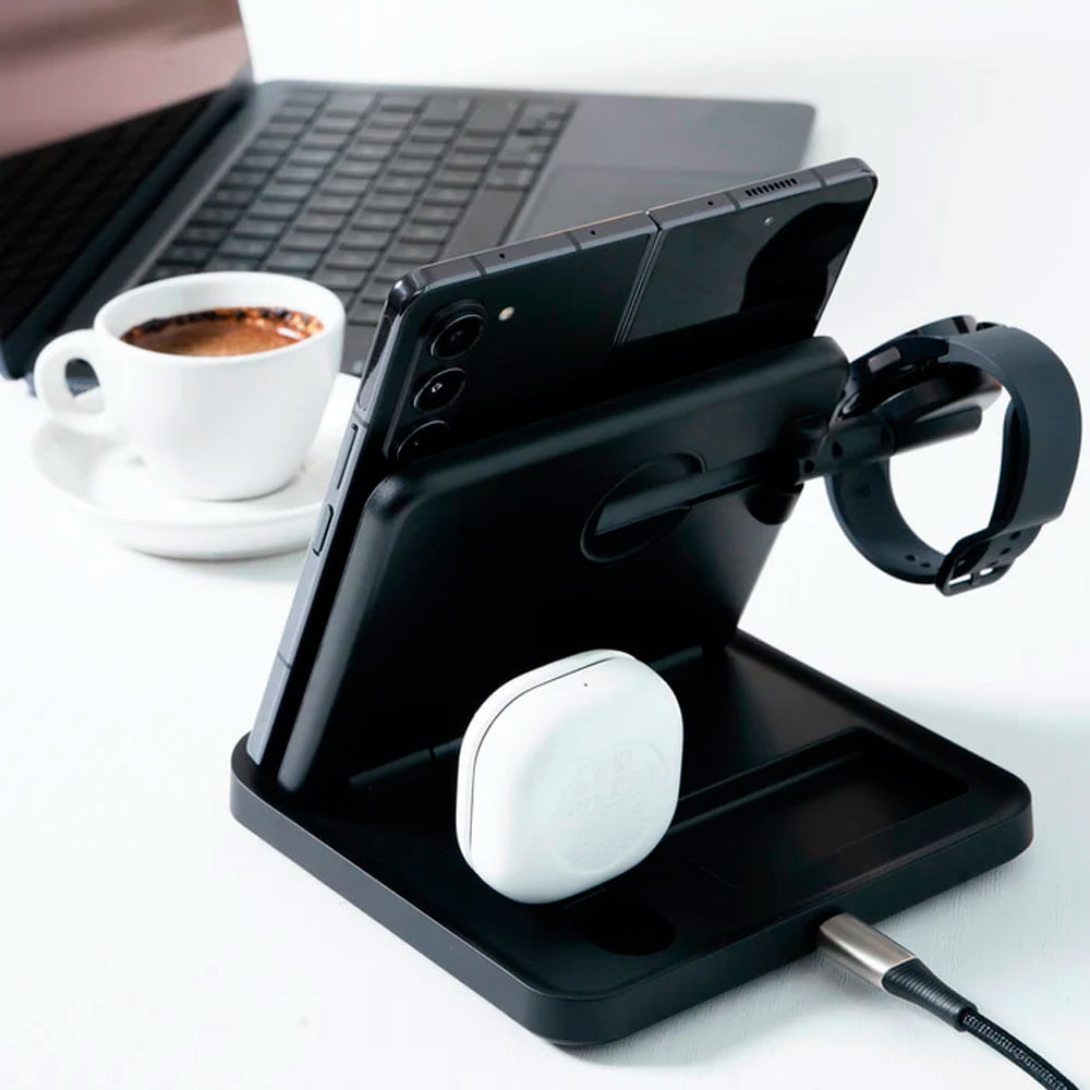 Carga inalámbrica 3 en 1 para dispositivos Samsung Diseñada para cargar al mismo tiempo tu Galaxy Z Flip/Fold o serie S, Galaxy Watch (3 en adelante) y Galaxy Buds, todo en una sola estación.