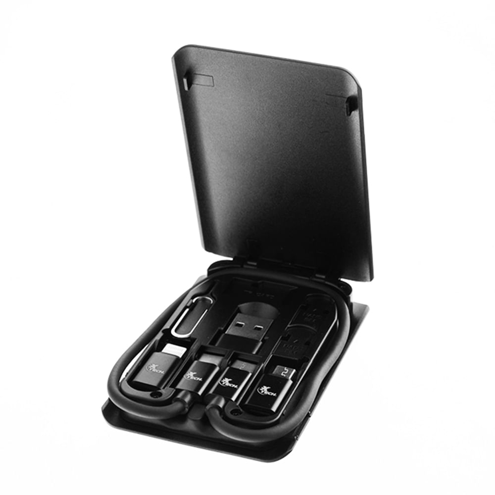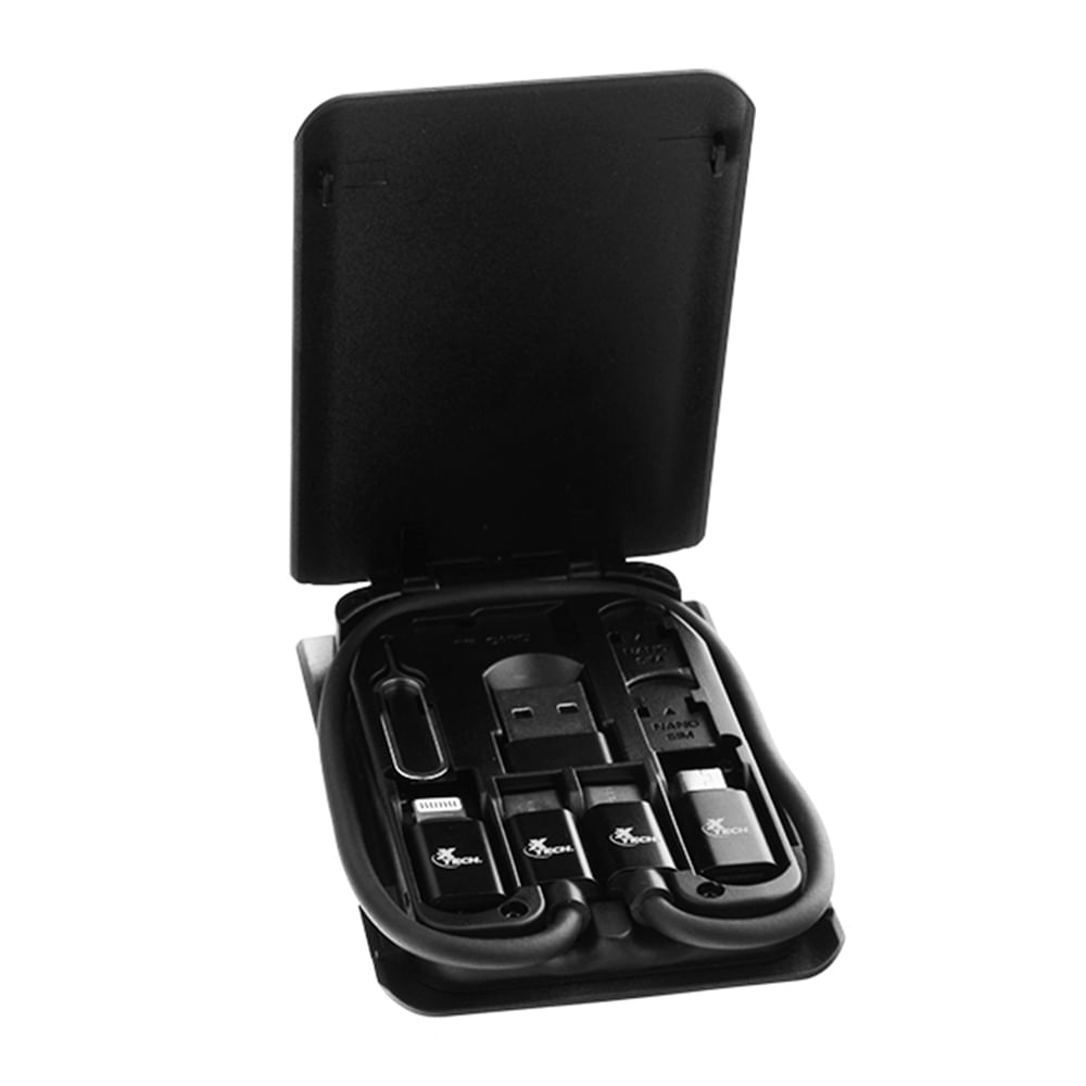 Estuche liviano y portátil multifuncional para almacenamiento que ofrece una solución práctica para necesidades de carga y transferencia de datos. Mantiene tus cables organizados y listos para usar cuando viajas o te encuentras en movimiento. Incluye: Cable Tipo C a Tipo C, adaptador USB Tipo A, adaptador Micro USB, adaptador Lightning, dos ranuras para almacenar tarjetas NANO SIM, una ranura para almacenar tarjeta TF y una clavija para extraer tarjeta SIM.