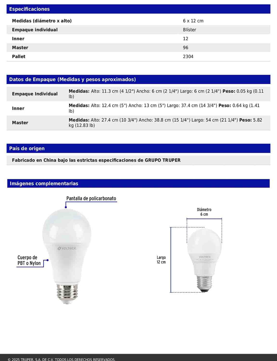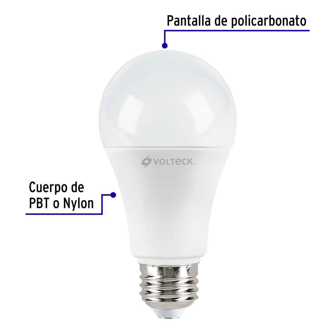 Foco LED de alto rendimiento que ofrece hasta 85% de ahorro energético respecto a los focos incandescentes. Brinda encendido instantáneo, luz blanca fría de 6500 K y emisión omnidireccional para una iluminación más amplia. Su cuerpo de PBT o nylon con pantalla de policarbonato mejora la durabilidad y no es compatible con atenuadores.