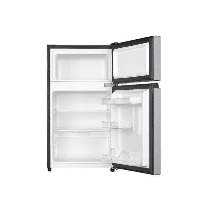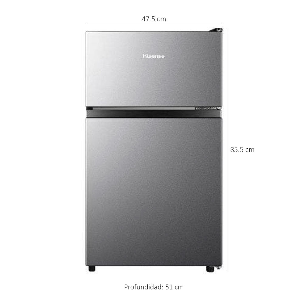 Hisense RT33D6AAE es una mini refrigeradora doble puerta con capacidad de 3 cu ft (93 L) que combina diseño práctico y tecnología eficiente para entornos restringidos como oficinas, dormitorios o departamentos pequeños.