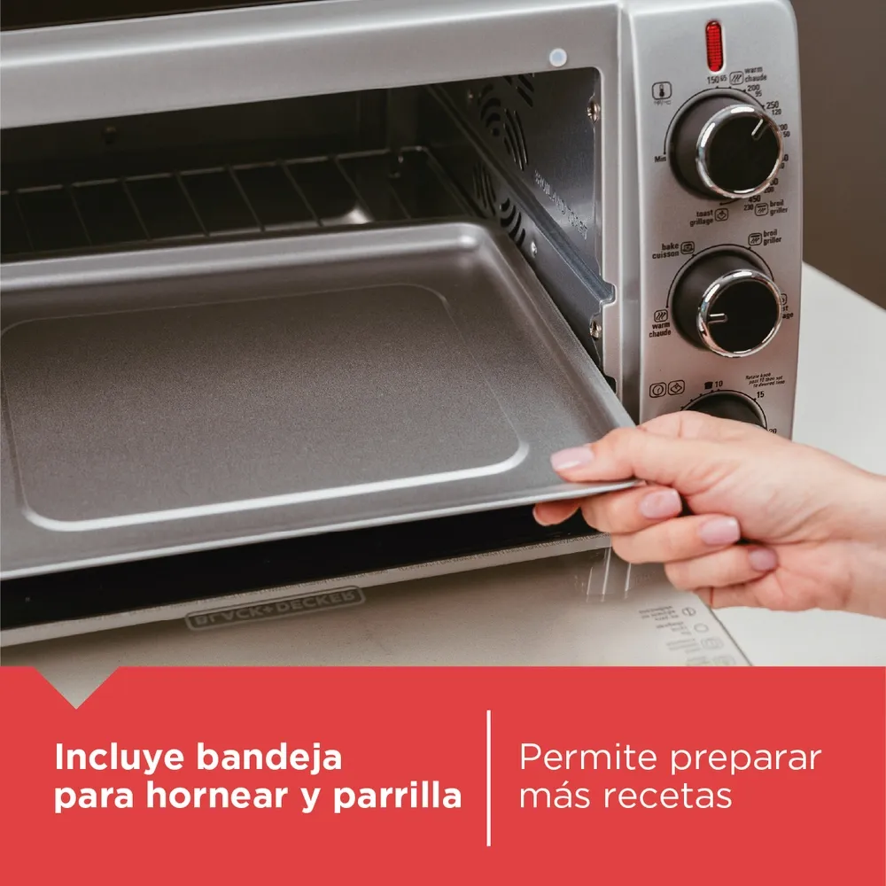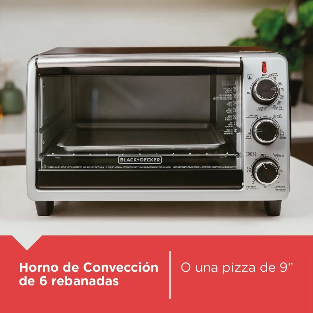 El horno de seis Rebanadas de pan Black+Decker tiene tecnología de convección que circula aire caliente para cocinar pizzas y congelados favoritos por mínimo tiempo. El interior está diseñado para el enfoque hacia la comida rápida e incluso cocinar. Las Funciónes de Coción son Hornear , asar, tostar y mantener caliente. Tiene una capacidad para una pizza de 9" o seis Rebanadas de pan.