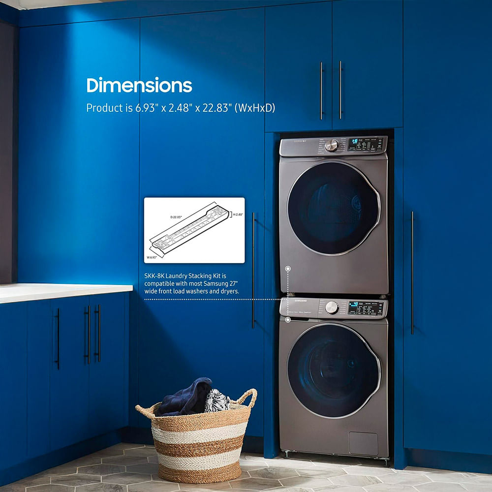 ¿Necesitas más espacio en tu área de lavado? El Kit de Apilamiento Samsung es la solución perfecta para organizar tu lavadora y secadora de manera eficiente. Diseñado específicamente para la mayoría de los modelos Samsung de 27" de ancho y carga frontal, este kit te permite apilar la secadora de forma segura sobre la lavadora, liberando valioso espacio en el piso sin sacrificar funcionalidad.