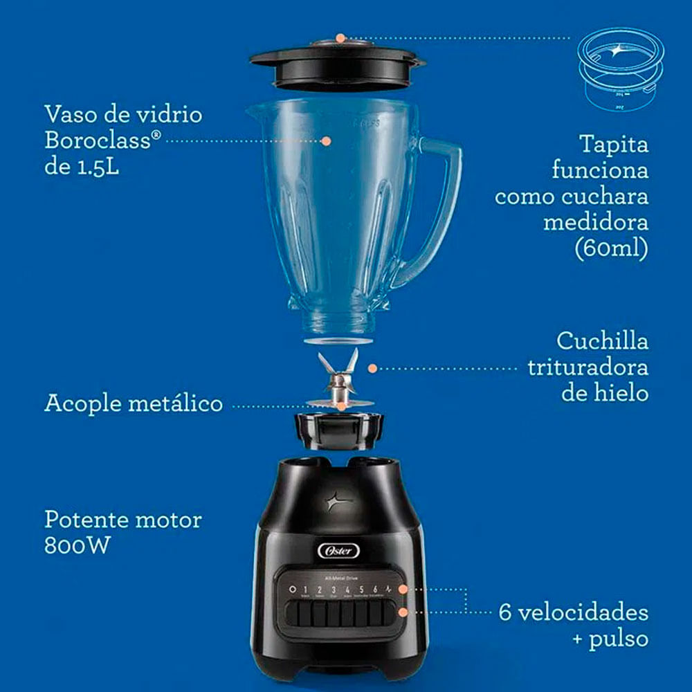 Licuadora Oster® con 6 velocidades más pulso cuenta con un motor de 800 Watts de potencia que es 4 veces más duradero. Su vaso de Boroclass® es resistente a ingredientes hirviendo. Además tiene una revolucionaria cuchilla pica hielo para preparar los mejores jugos y smoothies. Su acople metálico es 10 veces más fuerte, por lo que no tendrás ninguna dificultad procesando los ingredientes más duros.
