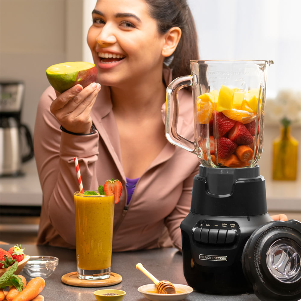 Ya no tendrás que parar, revolver o agitar para eliminar atascos en tu licuadora. La licuadora BLACK+DECKER® Performance HELIX™ cuenta con nuestra exclusiva tecnología Blade Boost™ para que pueda licuar hasta un 50 por ciento más rápido*. Simplemente presione hacia abajo la jarra de la licuadora para elevar la altura de las cuchillas y romper las bolsas de aire, agarrando los ingredientes de arriba y creando un poderoso vórtice: ¡así de fácil! Además, con cuatro velocidades, incluidas dos configuraciones de pulso, una cuchilla de acero inoxidable de 4 puntas y 800 vatios de potencia máxima para picar hielo+, nada puede interponerse en su camino. El vaso mezclador de vidrio Perfect Pour con capacidad para 6 tazas y la tapa con ranura para ingredientes incorporada y tapa medidora lo convierten en el compañero de cocina perfecto para crear batidos, purés, sopas y más con facilidad. Aún mejor, una vez que haya terminado, las piezas extraíbles se pueden lavar en el lavavajillas para una limpieza sencilla.