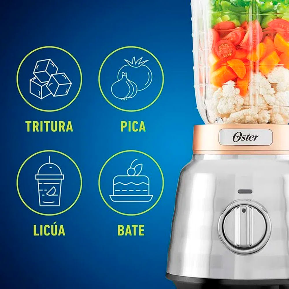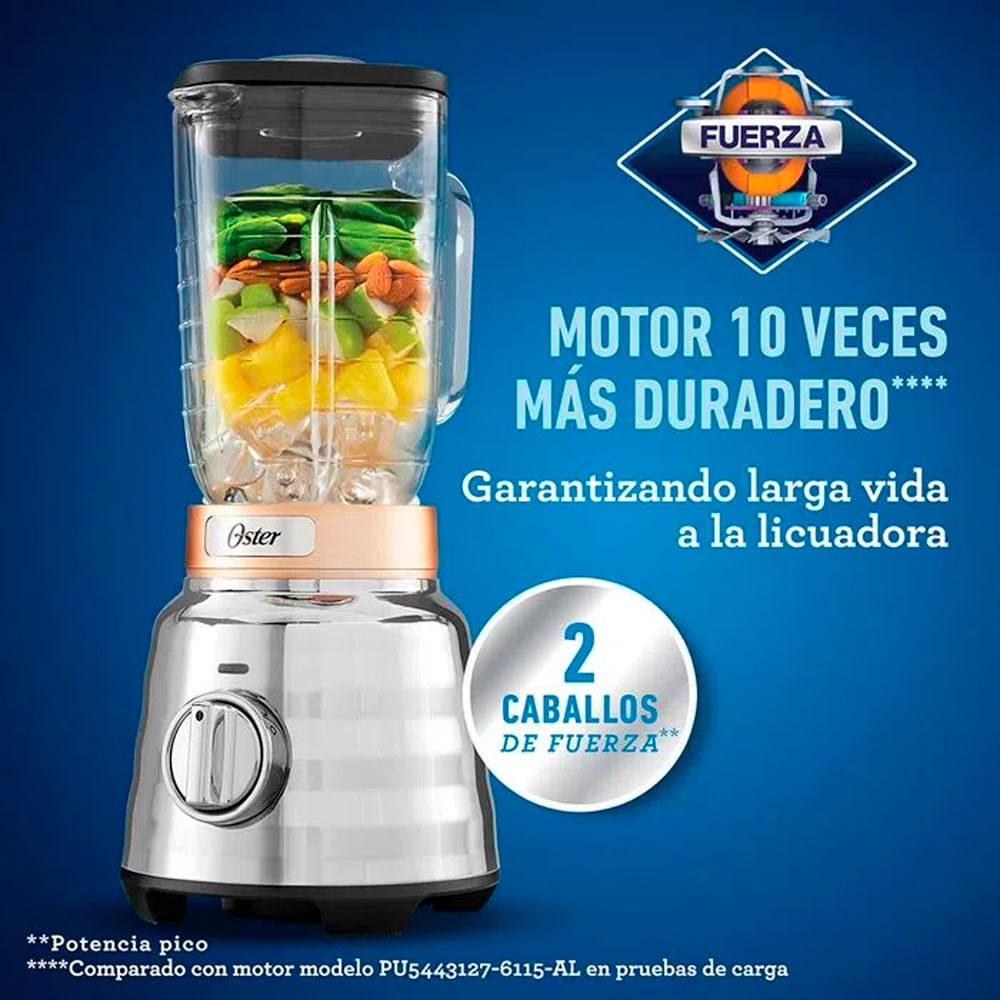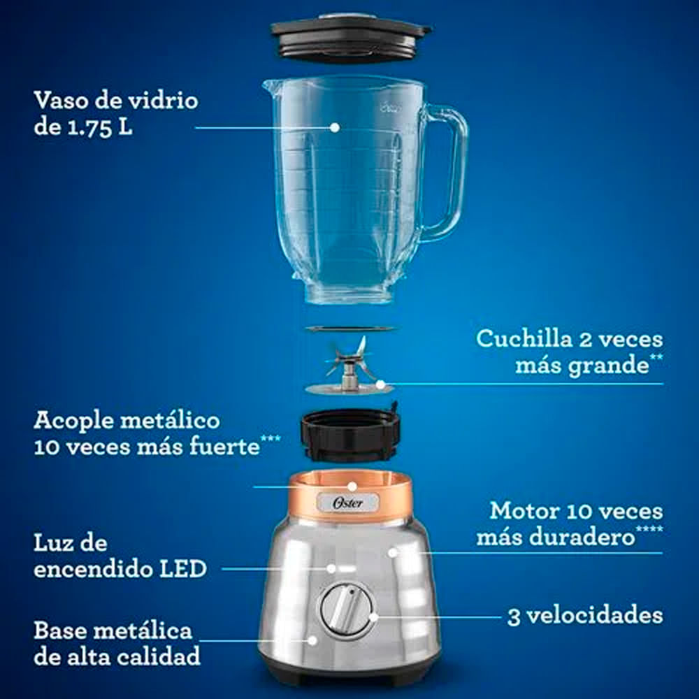 Inspirado en nuestra clásica licuadora Oster este modelo es más duradero y potente. Su acabado metálico en la base es más elegante para un consumidor exigente como tú. El frasco tiene una capacidad de 1.75 litros, un motor de 2 caballos de fuerza máximos y una cuchilla trituradora de hielo más grande que la normal. Es una licuadora que te permite preparar los platos más ricos, jugos y batidos con ingredientes duros o difíciles de mezclar todos los días. En él puedes mezclar todo, desde sopas y batidos, jugos, magdalenas, salsas, condimentos, pasteles y muchas otras recetas. Sea lo que te provoque, puedes hacerlo de una manera sencilla, fácil y agradable, obteniendo resultados profesionales. Es la licuadora la que te da el poder de crear todo lo que imaginas.