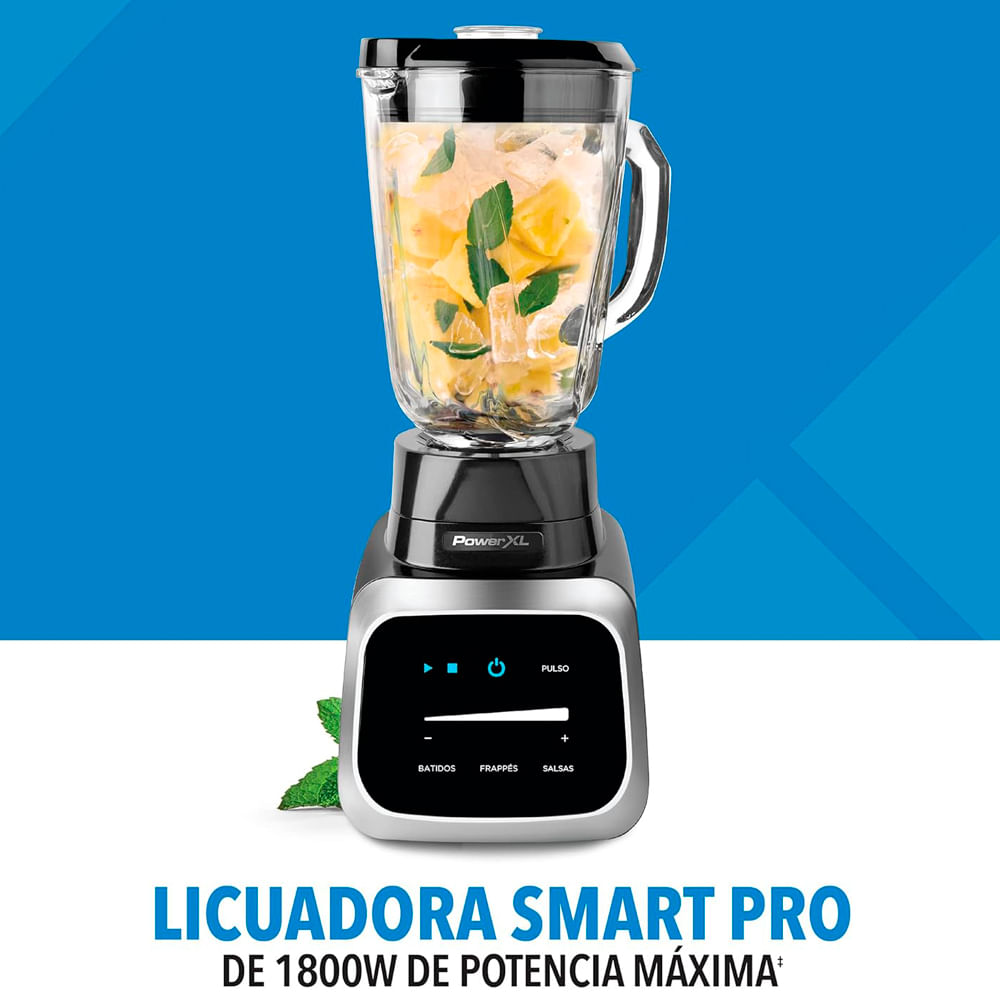Licuadora PowerXL Smart Pro BL6018-0BPLA. Con potencia máxima de 1800W para triturar y moler todo tipo de alimentos, licúa hasta 75% más rápido y obtén licuados hasta un 99% mas cremosos. La licuadora PowerXL tiene 6 poderosas cuchillas de titanio 3 veces más resistentes para una larga duración y excelentes resultados en tus preparaciones.