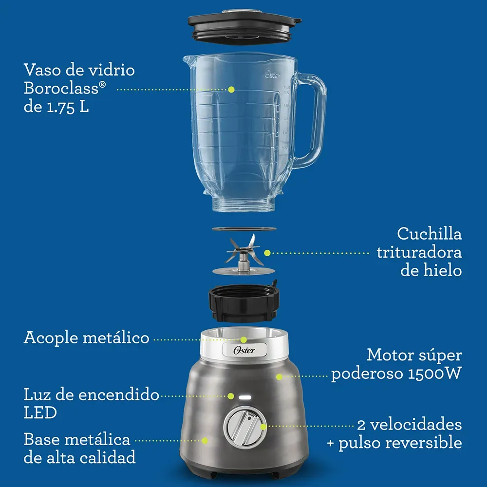Inspirada en nuestra clásica licuadora Oster®, este modelo es más duradero y poderoso. Su acabado metálico en la base es más elegante para un consumidor exigente como tú. El vaso tiene 40% más de capacidad*, un motor de 2 caballos de fuerza de potencia pico y una cuchilla trituradora de hielo más grande que las regulares**. Es una licuadora que te permite preparar día a día los más ricos platos, jugos y licuados con ingredientes duros o difíciles de mezclar. En ella puedes mezclar desde sopas y batidos, hasta jugos, muffins, salsas, sazonadores, tortas y muchas otras recetas. Lo que te provoque, lo puedes hacer de manera sencilla, fácil y agradable, obteniendo resultados profesionales. Es la licuadora que te da el poder para crear todo lo que imaginas.
