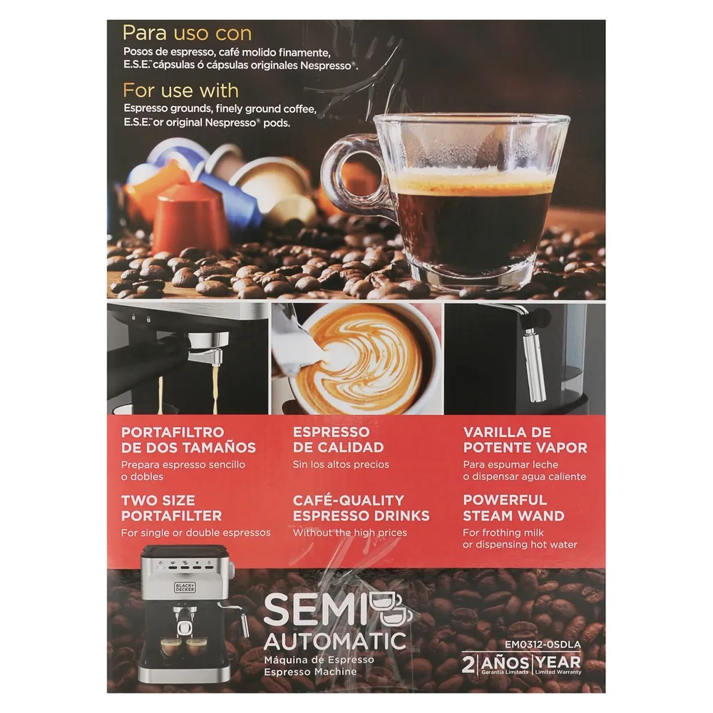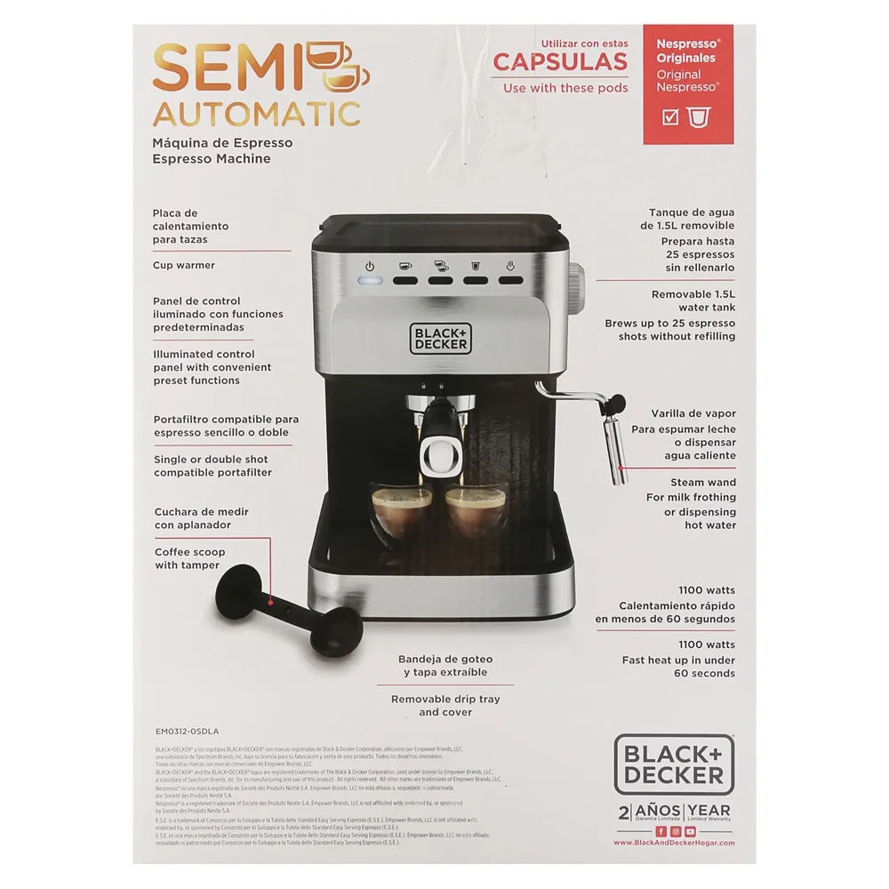 La máquina para café Black & Decker Espresso facilita la preparación de espresso en el hogar. Su diseño funcional permite obtener café concentrado con facilidad, ideal para bebidas calientes y recetas especiales. Cuenta con controles prácticos y estructura estable para un uso constante. Es una opción conveniente para quienes desean disfrutar café espresso sin salir de casa. Compra en línea y eleva tu experiencia cafetera.