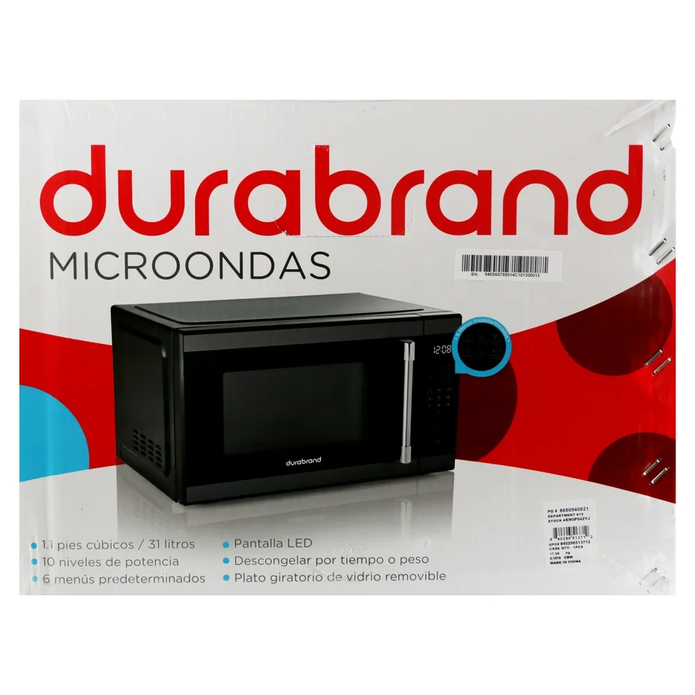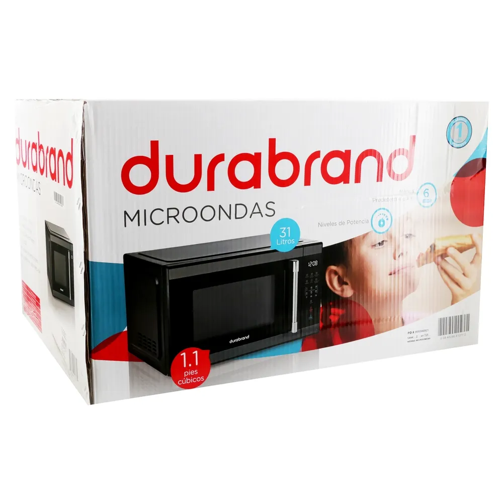 El microondas Durabrand digital de 1.1 pies cúbicos está orientado a un calentamiento práctico con controles sencillos. El panel electrónico incorpora temporizador, potencias ajustables y programas automáticos para descongelar por tiempo o peso. El plato giratorio mejora la distribución del calor en recipientes habituales y la cavidad admite contenedores aptos para microondas. El exterior de acero inoxidable se integra en distintos estilos de cocina y facilita el mantenimiento. Su tamaño favorece preparar porciones medianas sin ocupar demasiado espacio en encimeras. Pensado para un uso frecuente con resultados previsibles.