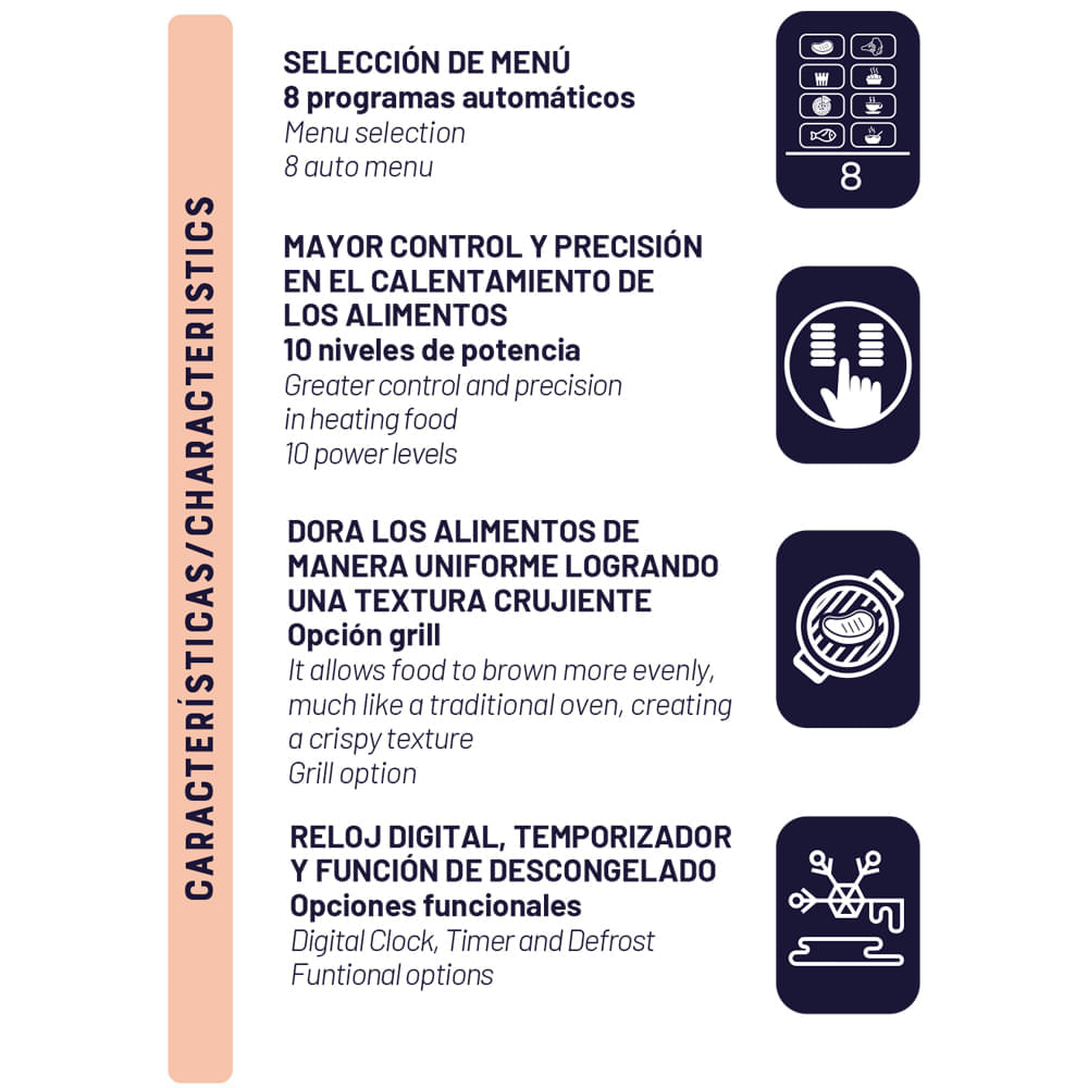 •Programas de Cocción: 8 programas automáticos para cocinar, calentar o descongelar con un toque.