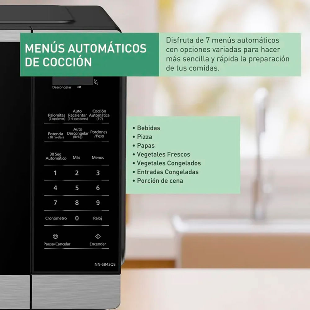- 7 programas preestablecidos automáticos: incluye opciones para recalentar, cereal, bebida, tocino, alimentos congelados, papas, pizza congelada y palomitas, adaptando tiempo y potencia automáticamente.