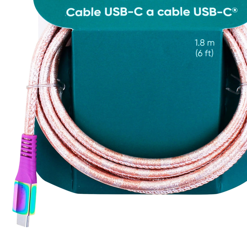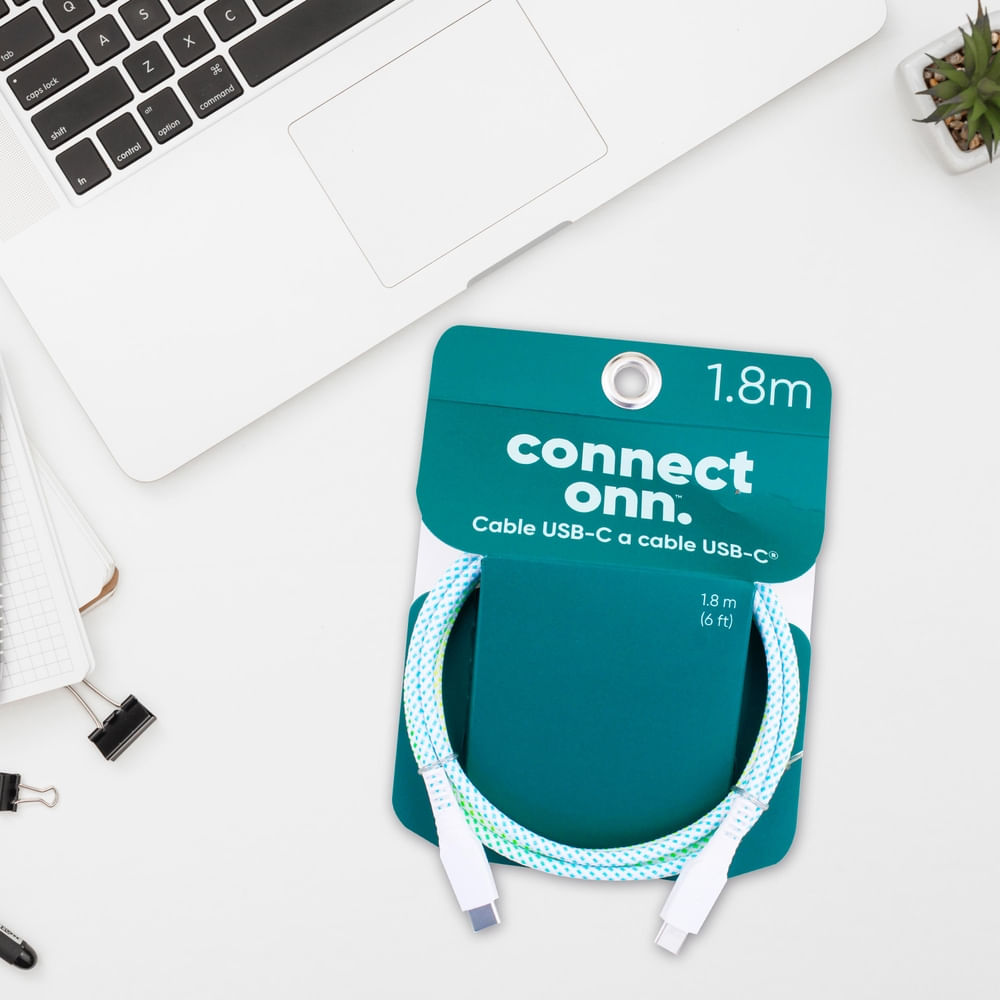 Cable USB-C a USB-C de la marca Onn en color neon amarillo. Ideal para cargar y sincronizar dispositivos con entrada USB-C. La longitud total del cable es de 1.0 Ud y es resistente y duradero.
