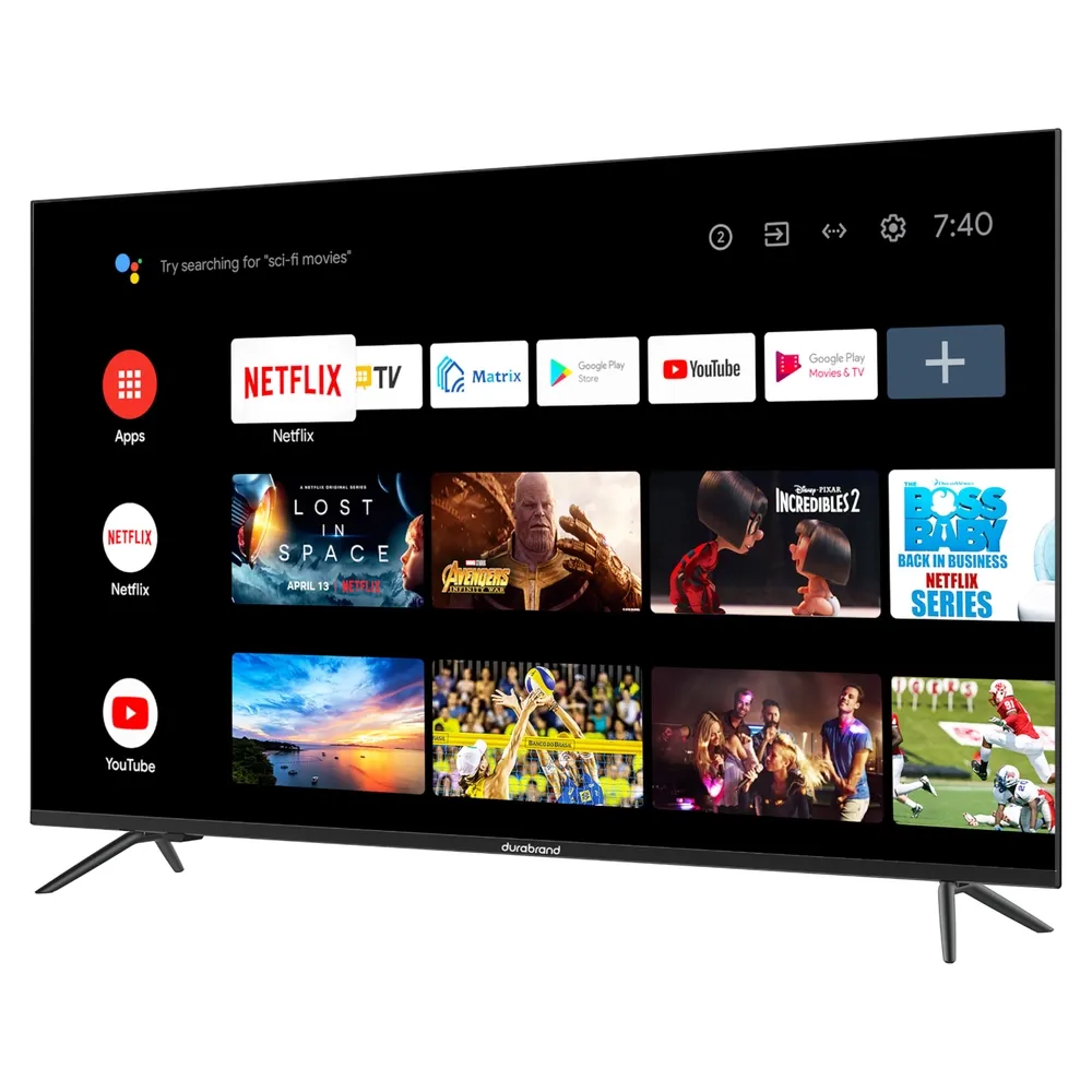 Pantalla HQLED Smart 4K de 65 pulgadas de la marca Durabrand. Este televisor cuenta con sistema operativo Android TV, proporcionando una experiencia de usuario fluida y acceso a numerosas aplicaciones. Ideal para disfrutar de contenido en alta definición y con múltiples opciones de conectividad.Información del producto: La información de este producto es proporcionada por fabricantes y distribuidores. Te recomendamos verificar las especificaciones con el fabricante para obtener detalles más actualizados.