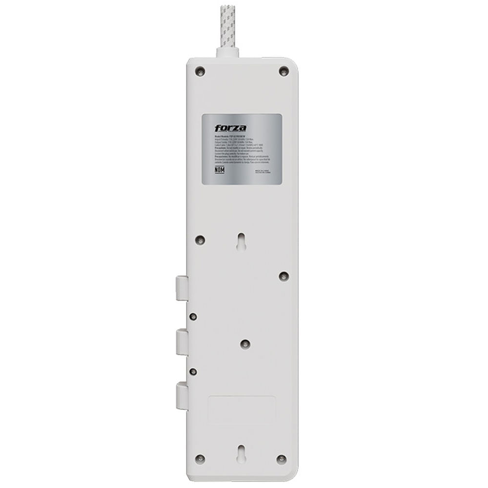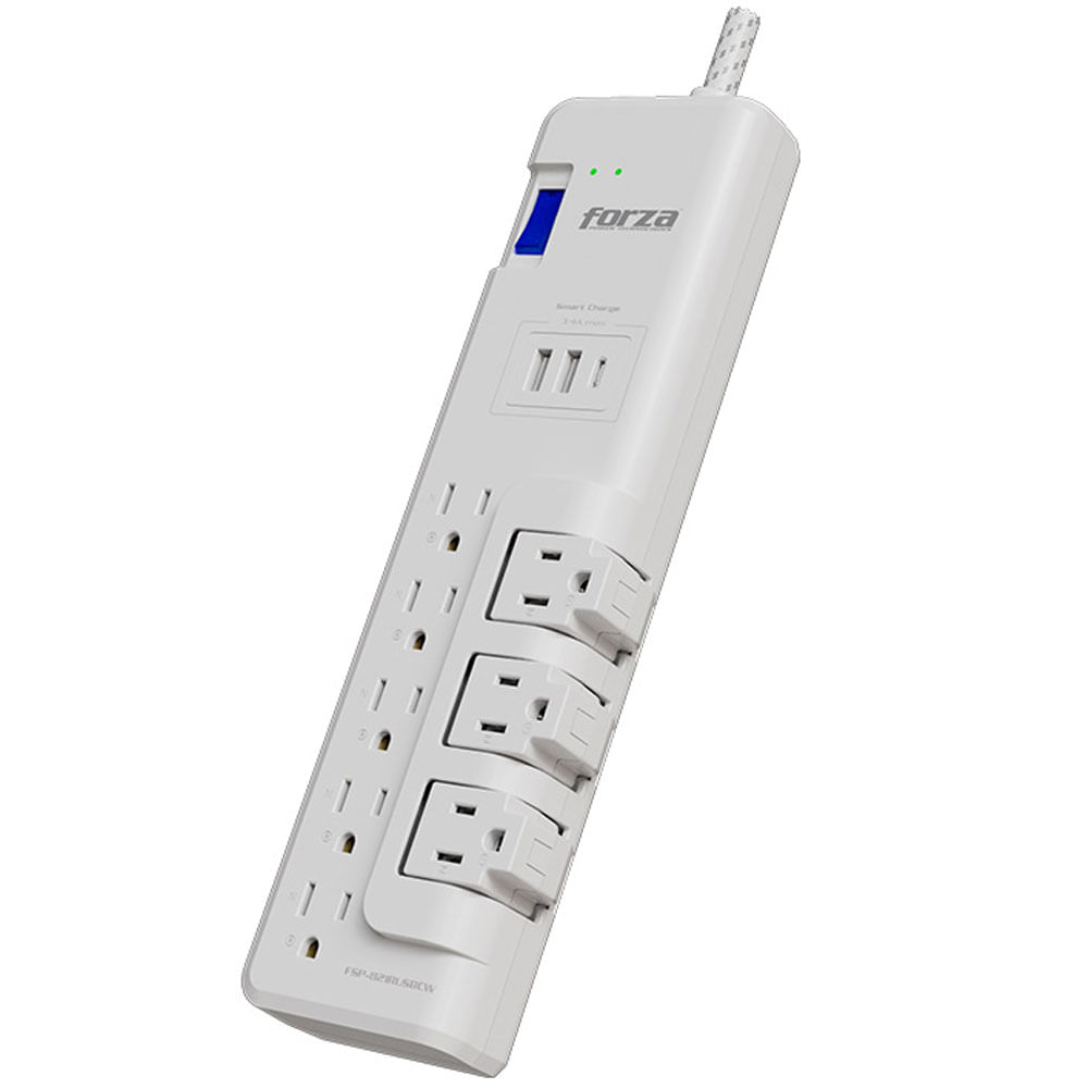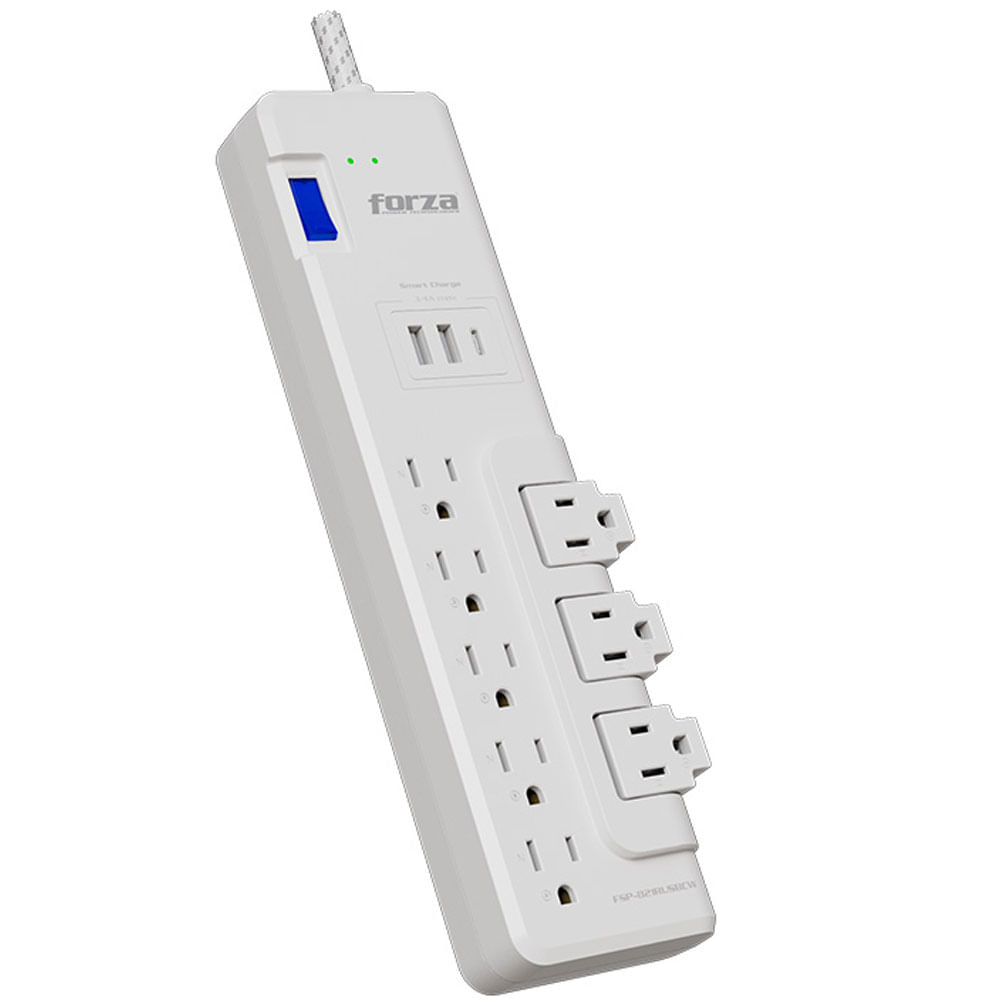 Protege tus electrodomésticos, dispositivos electrónicos y equipos de entretenimiento con el protector de sobretensión Forza FSP-821RUSBCW. Diseñado para salvaguardar contra corrientes excesivas, descargas eléctricas y sobrecargas, este protector ofrece una capacidad máxima de 1625W y una clasificación de protección de 2,200J. Sus ocho tomacorrientes (cinco estándar y tres giratorios de 90°) maximizan el espacio al acomodar enchufes voluminosos con facilidad. Incluye dos puertos USB Tipo A y un puerto Tipo C con salida de 5V/3.4A cada uno, ideales para cargar dispositivos móviles. Su cable trenzado de 1.8 m y ranuras de montaje lo hacen versátil para cualquier espacio.