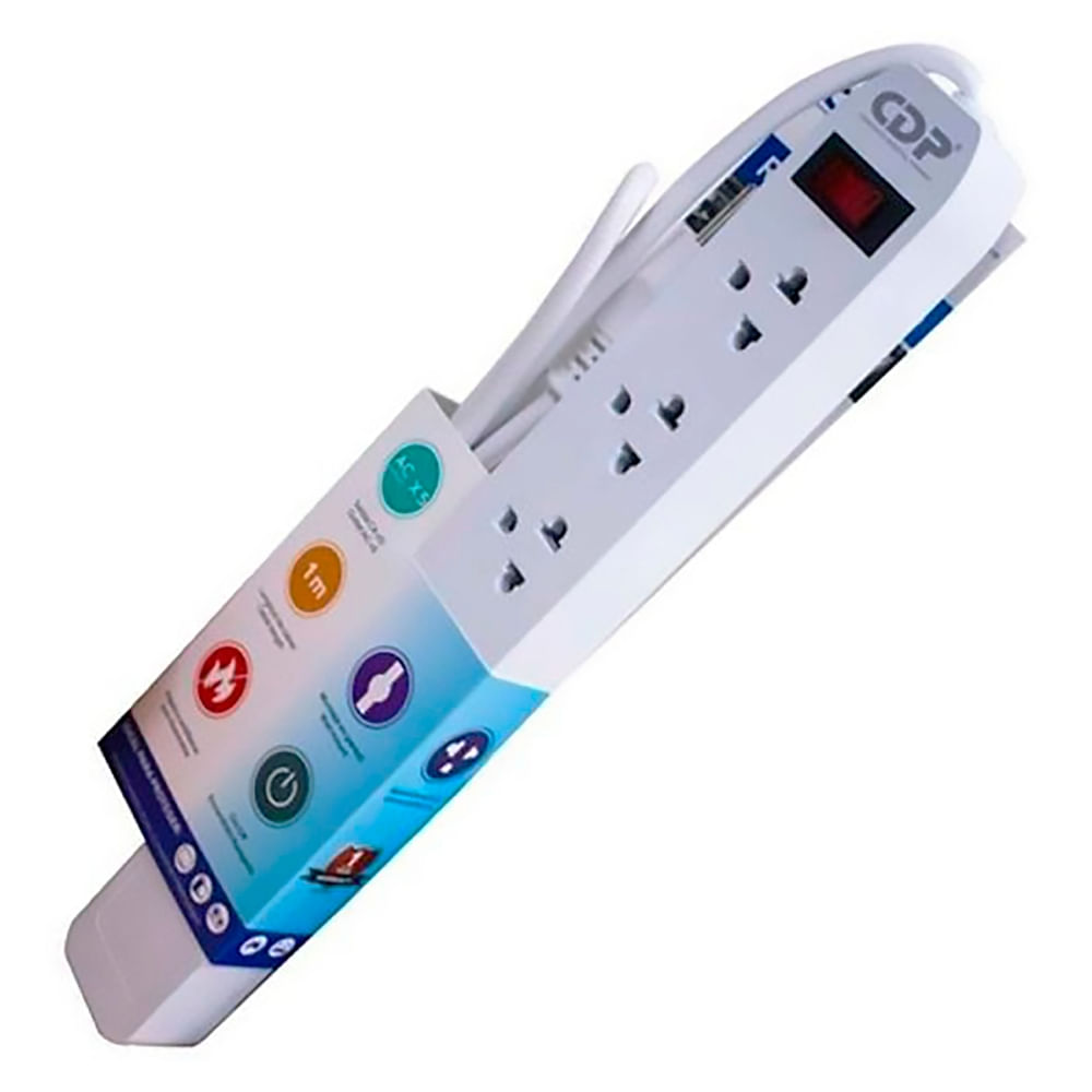 Regleta eléctrica Cdp con 5 salidas y 3 puertos USB. Ideal para organizar y aumentar la cantidad de tomas de corriente disponibles en tu hogar u oficina. Su diseño compacto y funcional asegura un uso eficiente del espacio. Equipado con un sistema de protección contra sobrecargas, cortocircuitos y picos de tensión, esta regleta asegura que tus dispositivos estén protegidos de fluctuaciones de energía que podrían dañarlos.