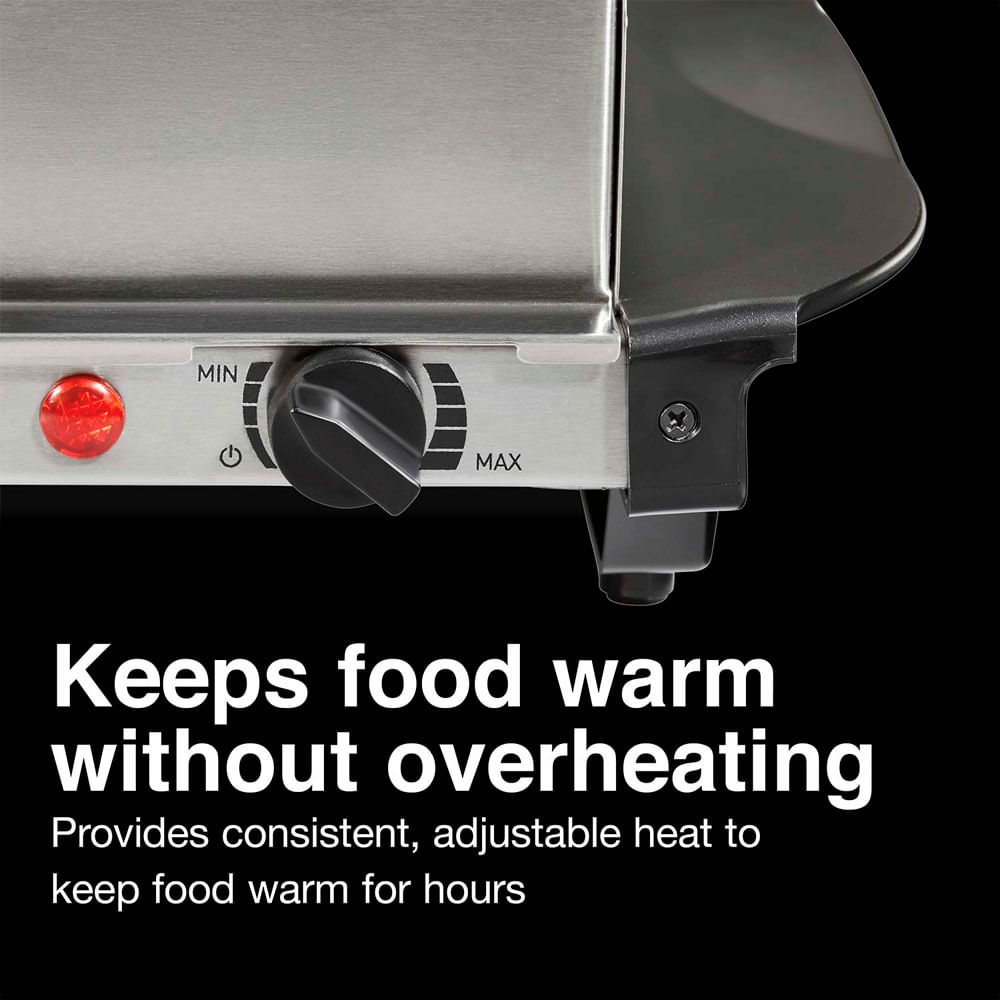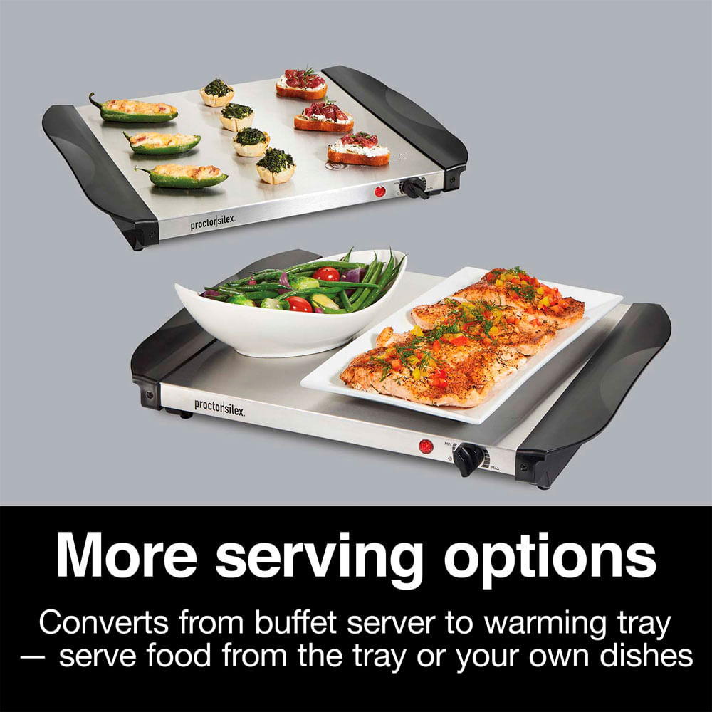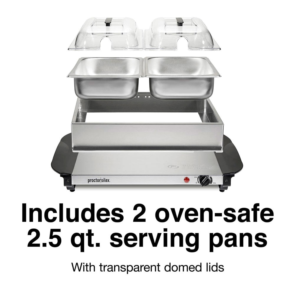 Con el servidor de buffet doble Proctor Silex®, puede servir comida caliente a familiares e invitados durante las fiestas y otras ocasiones especiales de 3 maneras diferentes. Sirva la comida en las 2 sartenes aptas para horno incluidas; puede cocinar directamente en las sartenes. Sirva aperitivos, brochetas y bocadillos directamente desde la gran bandeja calentadora. O sirva recetas que haya preparado en sus propias cacerolas y sartenes resistentes al calor mientras se mantienen calientes en la bandeja calentadora eléctrica. Cada sartén incluida tiene capacidad para 2,5 cuartos de comida, perfecta para platos principales y guarniciones grandes. Cada recipiente tiene una tapa abovedada transparente y unos cómodos reposapiés mantienen las tapas abiertas para que los invitados puedan servirse ellos mismos sin tocar nada. El servidor de buffet proporciona calor constante y ajustable para mantener la comida caliente durante horas sin sobrecalentarse. Ajuste fácilmente la temperatura con solo girar el dial. Una vez configurado, el servidor de buffet se enciende y apaga para mantener la temperatura adecuada. Las manijas se mantienen frías al tacto para que el servidor de buffet se pueda levantar o mover mientras aún está caliente, y las bandejas de acero inoxidable se pueden lavar en el lavavajillas para una fácil limpieza. El servidor de buffet es duradero y está respaldado por una garantía limitada de 3 años.