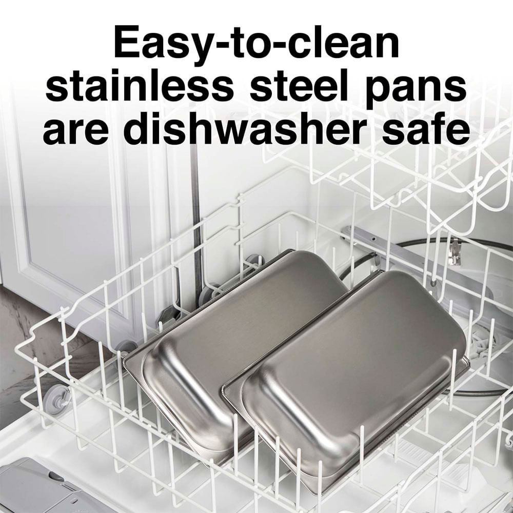 Las bandejas de acero inoxidable que vienen con la bandeja calentadora eléctrica son aptas para lavavajillas y las tapas se pueden limpiar o enjuagar fácilmente en el fregadero.