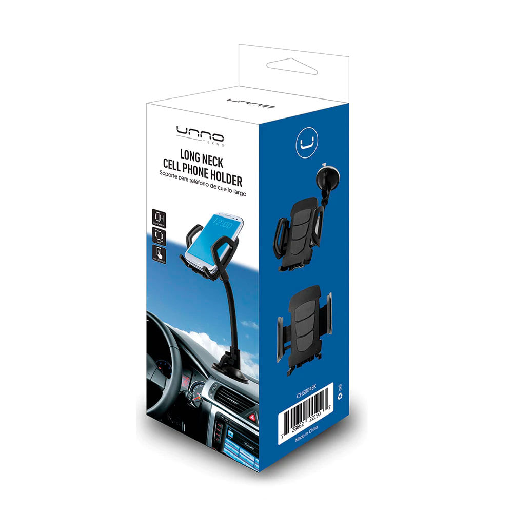 El Soporte para Móvil Unno Tekno CH3004BK es un accesorio de cuello largo con ventosa de gel, diseñado para sujetar tu teléfono de forma segura en el parabrisas o salpicadero del automóvil.Características principales