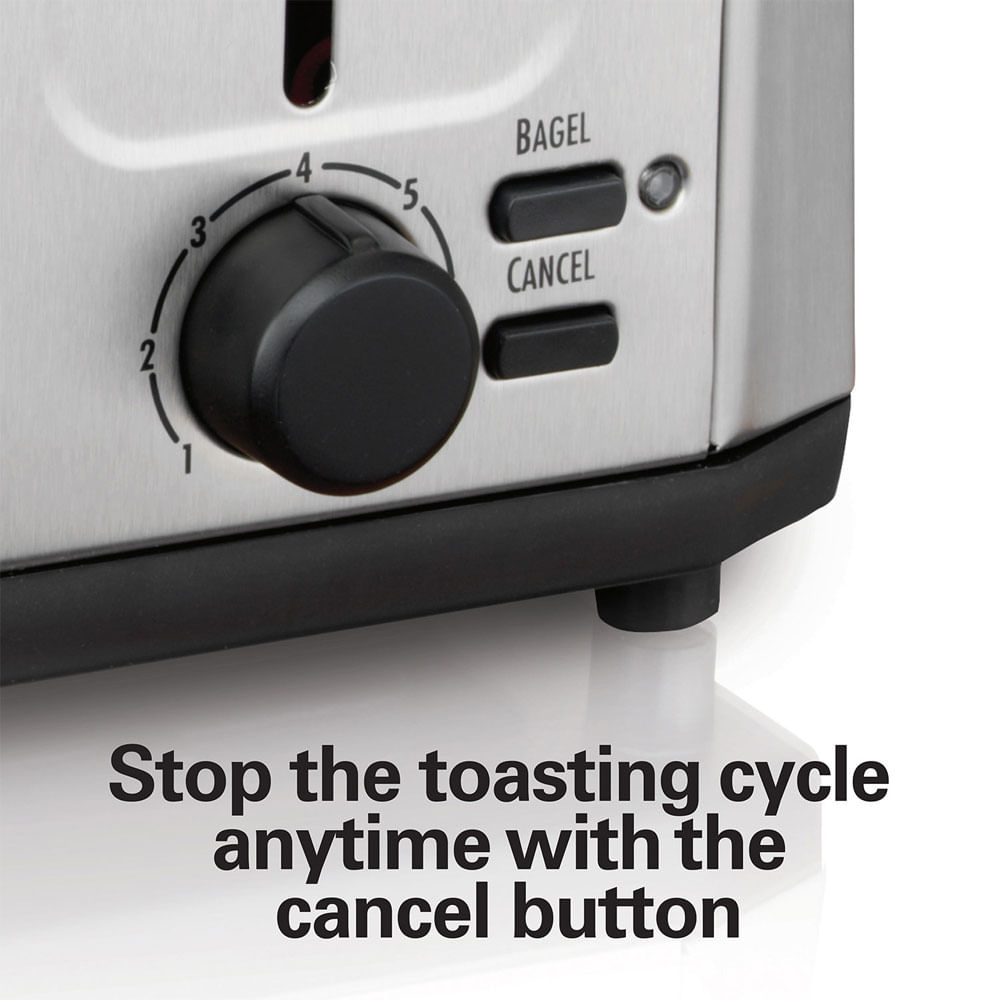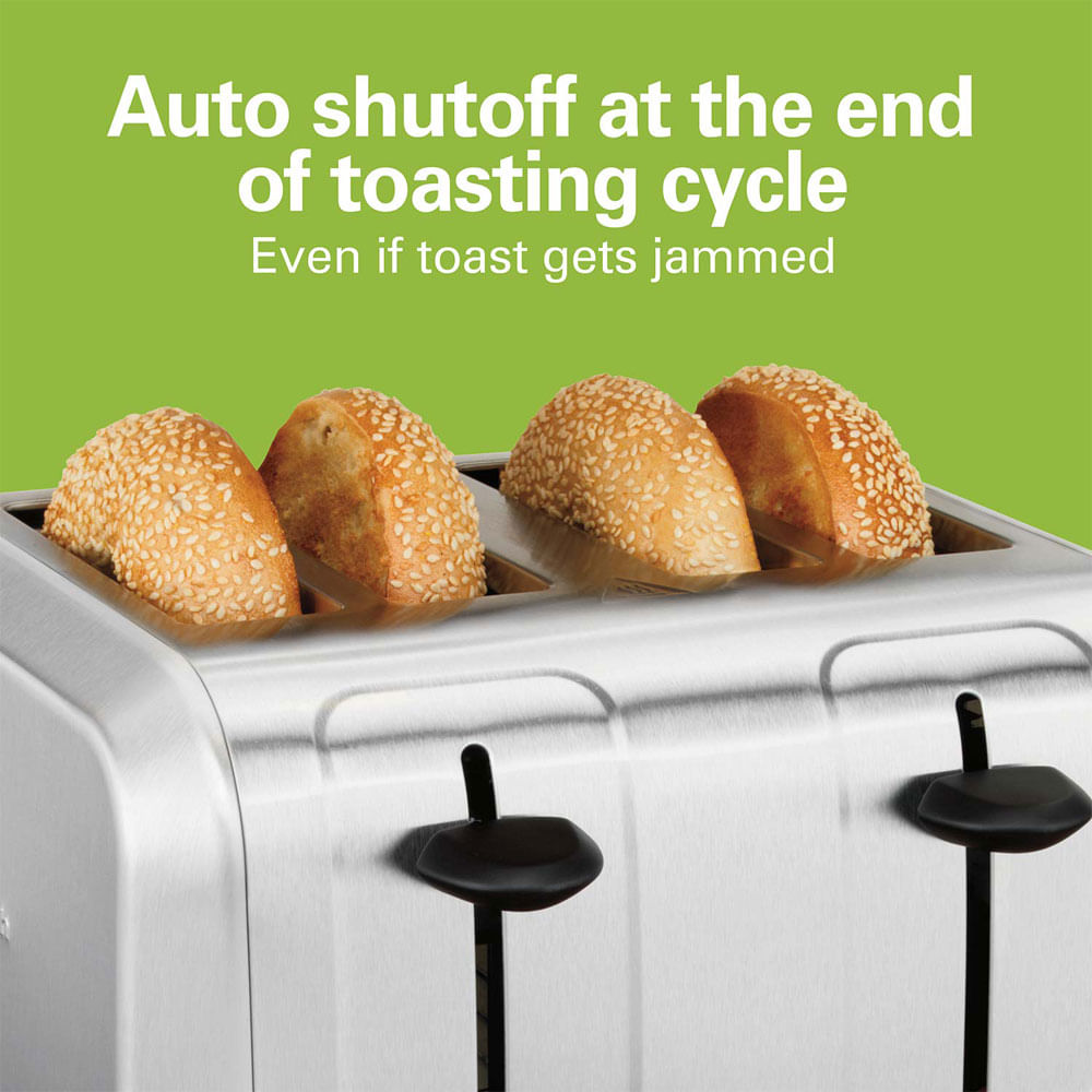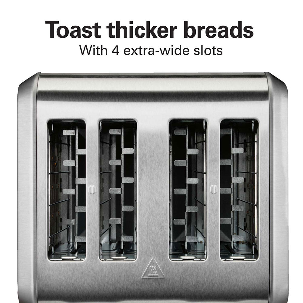 La tostadora de 4 rebanadas de acero inoxidable cepillado Hamilton Beach tiene 4 ranuras extra anchas para tostar fácilmente panes y bagels más gruesos.